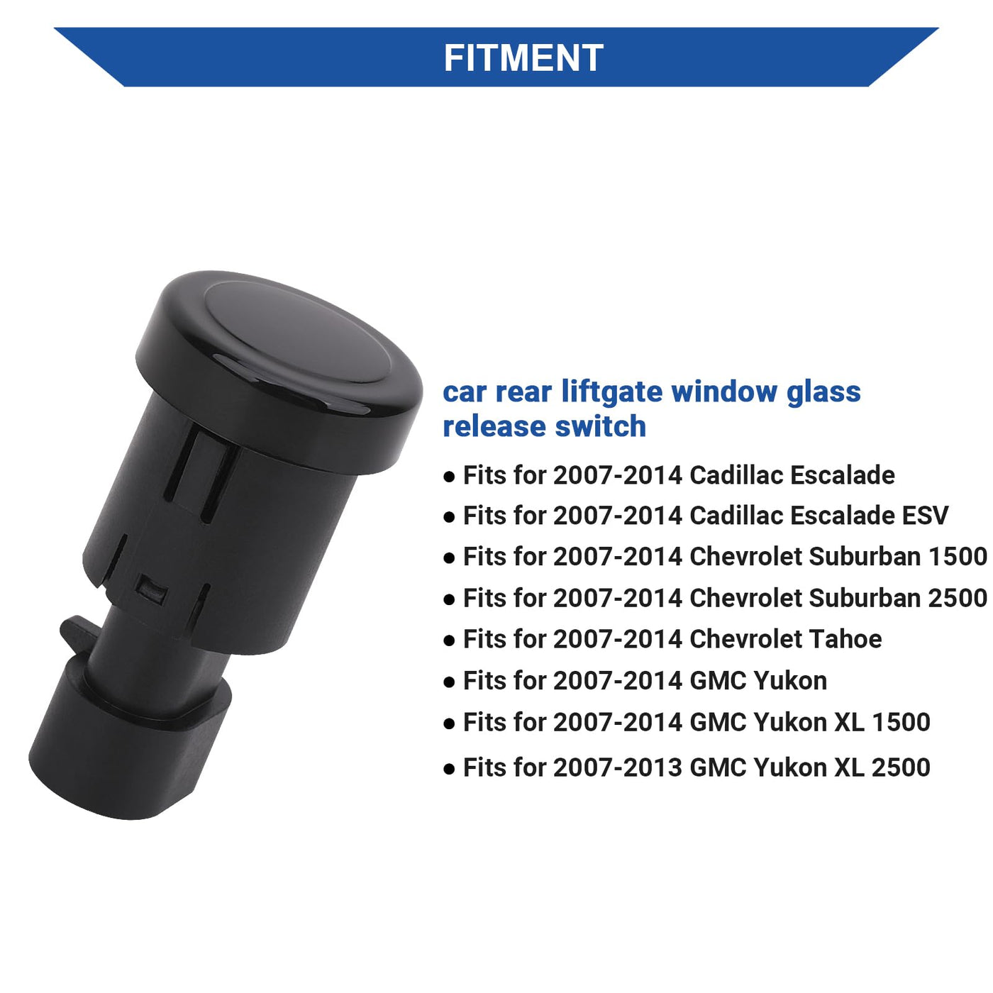 039Obaee branded car rear liftgate window glass release switch is durable, it can replace your defective switch at best cost. All of the models listed replacement switches have been 100% factory tested in compatibility. Compatible with the Following Vehicles:Compatible with Cadillac Escalade 2007 2008 2009 2010 2011 2012 2013 2014Compatible with Cadillac Escalade ESV 2007 2008 2009 2010 2011 2012 2013 2014 Compatible with Chevrolet Suburban 1500 2007 2008 2009 2010 2011 2012 2013 2014Compatible with Chevrolet Suburban 2500 2007 2008 2009 2010 2011 2012 2013Compatible with Chevrolet Tahoe 2007 2008 2009 2010 2011 2012 2013 2014 Compatible with GMC Yukon 2007 2008 2009 2010 2011 2012 2013 2014Compatible with GMC Yukon XL 1500 2007 2008 2009 2010 2011 2012 2013 2014Compatible with GMC Yukon XL 2500 2007 2008 2009 2010 2011 2012 2013 Replace below OE Part Number:1579806222863048D1994E Specification:Color: BlackTo Control: The car rear liftgateMaterial: ABS PlasticVoltage: DC 12VInstallation: Directly plug and play stylePackage Content:1 x Car Rear Liftgate Window Glass Release Switch. ?Purchase Without Worry?: Obaee branded car rear liftgate window glass release switch provides lifetime warranty. If the switch ever malfunctions on your vehicles contact us for a free replacement. Please Check the Product Description Before Purchasing to Make Sure this Parts will Fits on your Vehicle.