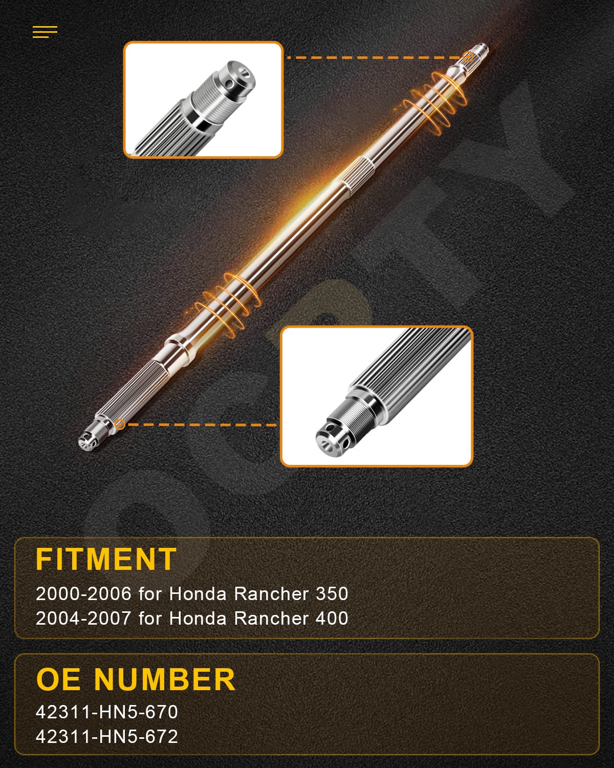 Q: What vehicles are compatible with the OCPTY Rear Wheel Axle?A: The OCPTY Rear Wheel Axle is compatible with the 2000-2006 Honda Rancher 350 and the 2004-2007 Honda Rancher 400 models.