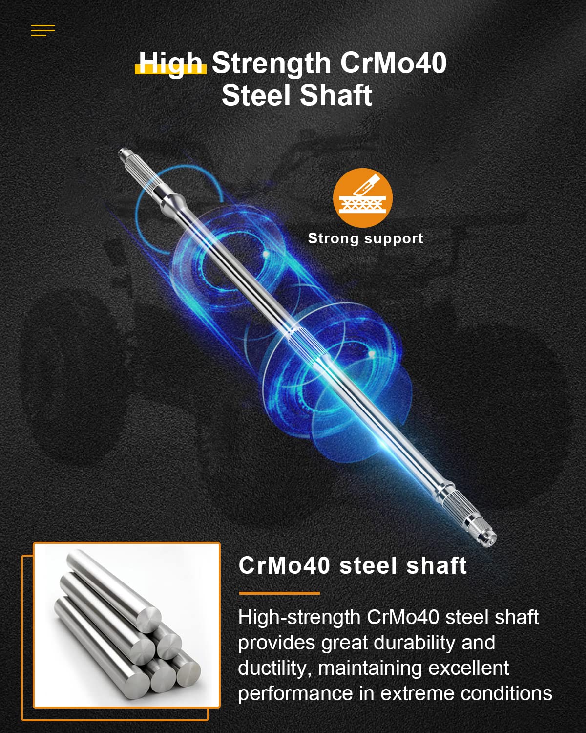 Q: What materials is the OCPTY Rear Wheel Axle made from?A: The rear axle is made from high-quality 40cr steel, ensuring durability and long life without the risk of aging or breaking.