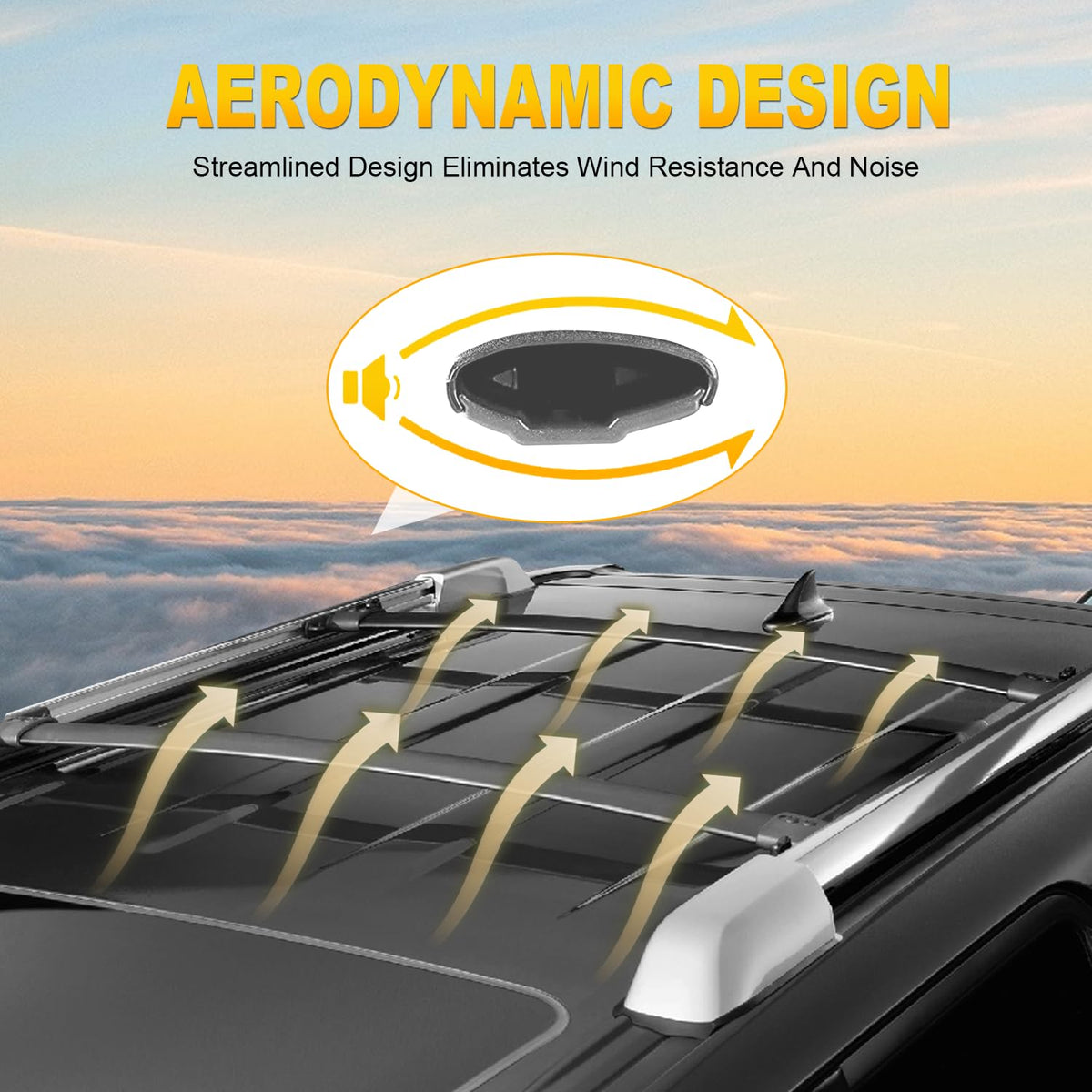 Why Choose Us? A Heavy Duty Clamping Mechanism Ensures The Cross Bars Will Remain Firmly Fastened To The Existing Side Rails, Featuring Padded Clamps To Prevent Scratching Surfaces. Low Profile Streamline Design,Efficiently Reduce Wind Resistance And Noise. Curved Upward Design To Fit Your Car Roof Arc. Made Of Aluminum,Light Weight And Durable Our Roof Rack Load-Capacity Can Support Up To 150Lbs.Whether It'S A Kayak, Mountain Bike, Or Skis, These Cross Bars Will Get Your Favorite Toys To Where The Fun Happens!