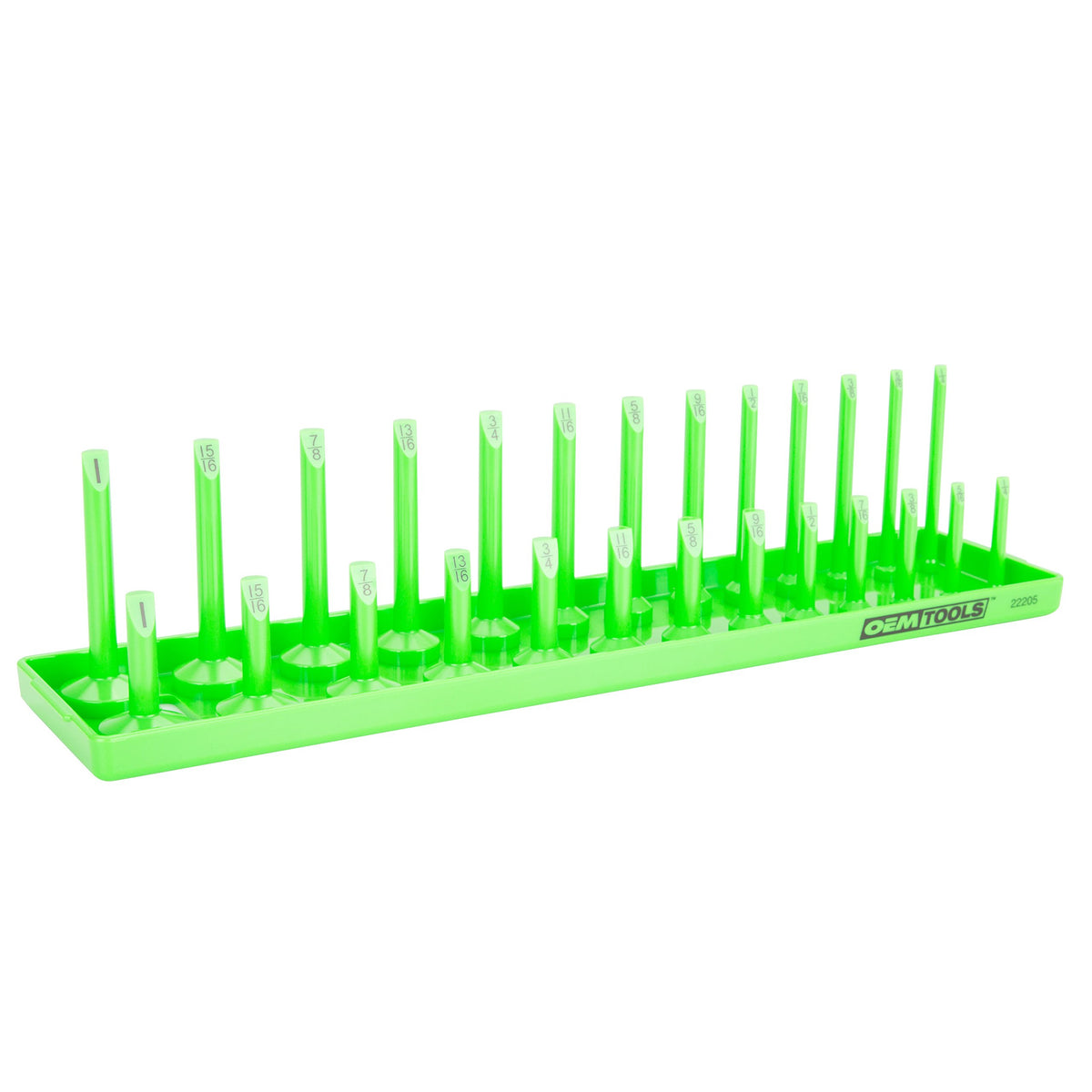 OUR SOCKET HOLDER / ORGANIZERS ARE DESIGNED TO FIT IN PROFESSIONAL TOOL CHESTS AND TOOL BOXES This tray is 13.2 inches (L) x 3 inches (W) x 3 inches (H), and will fit in most tool boxes, tool chests, and work benches, even standing straight up. This is an excellent tool box drawer organizers. All in all, you can organize 26 SAE Sockets (that’s 13 deep-well and 13 shallow SAE sockets) on this lightweight socket organization tray, which is made of a rugged plastic that’s tough enough to stand up to a lifetime of use. We’ve designed this tool with mechanics in mind. The posts make it easy to slip sockets on and to keep them secure. And when you need a particular socket, it slides right off. And the tray’s wide base keeps it from tipping over, even when you tool box is jostled. We’ve designed our socket set organizers to work so well, that you never have to think about them. SPECIFICATIONS: - Dual Rail System for Deep and Shallow Sockets - Posts are Clearly Labeled for Effortless Identification - Socket Range: 1/4” to 1” - Each Post Has an Extended Base for a More Secure Fit - Dimensions: 13.2' (L) x 3.0' (W) x 3.0' (H) QUALITY, INNOVATION, VALUE OEMTOOLS is the largest single source for automotive specialty tools, equipment, and shop lighting for professionals and DIY mechanics. The OEMTOOLS brand name is known for innovation, value, and quality, and is trusted by retailers, mechanics, contractors, and handy people the world over.
