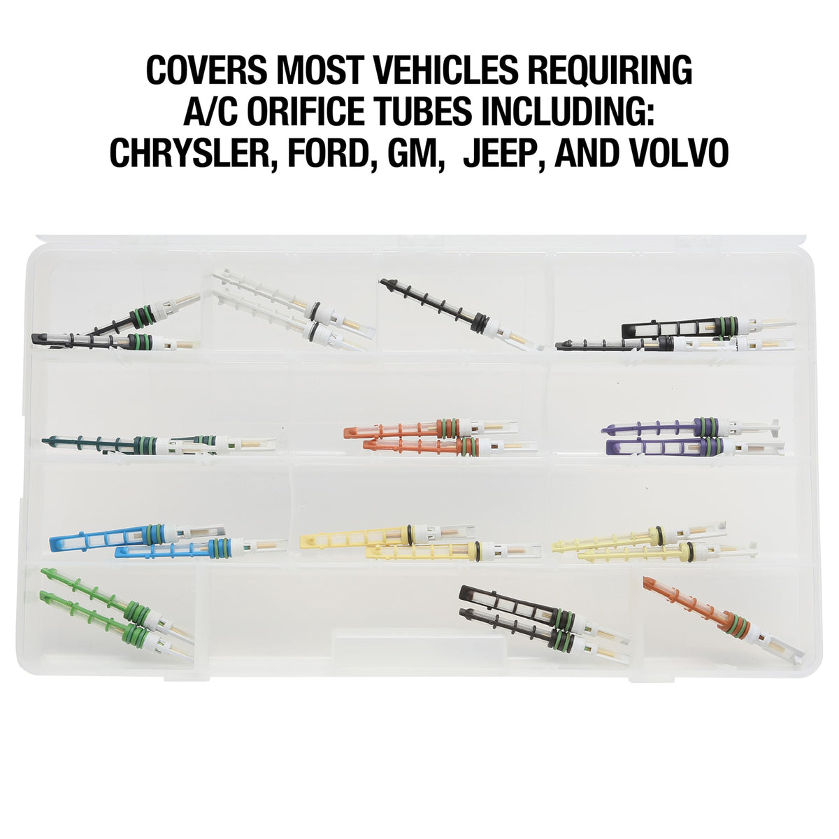 Q: What features come with the OEMTOOLS orifice tube assortment?A: This assortment includes various color-coded orifice tubes such as GM Black T-Top, Jeep Green-White, Ford Black, and many others, along with essential gaskets, O-rings, and seals for proper replacement.