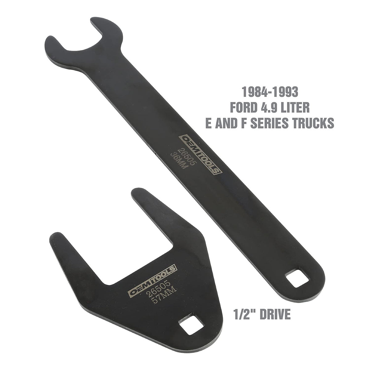 The OEMTOOLS Fan Clutch Wrench Set offers easy access to fan clutch nut on 1984 to 1993 Ford 4.9 liter E and F series engines, 1984 to 1987 Ford 4.6 liter modular engines, 2.8 liter engines, 1988 and newer 2.9 to 3.0 liter engines, and 1990 and newer 4.0 liter engines.