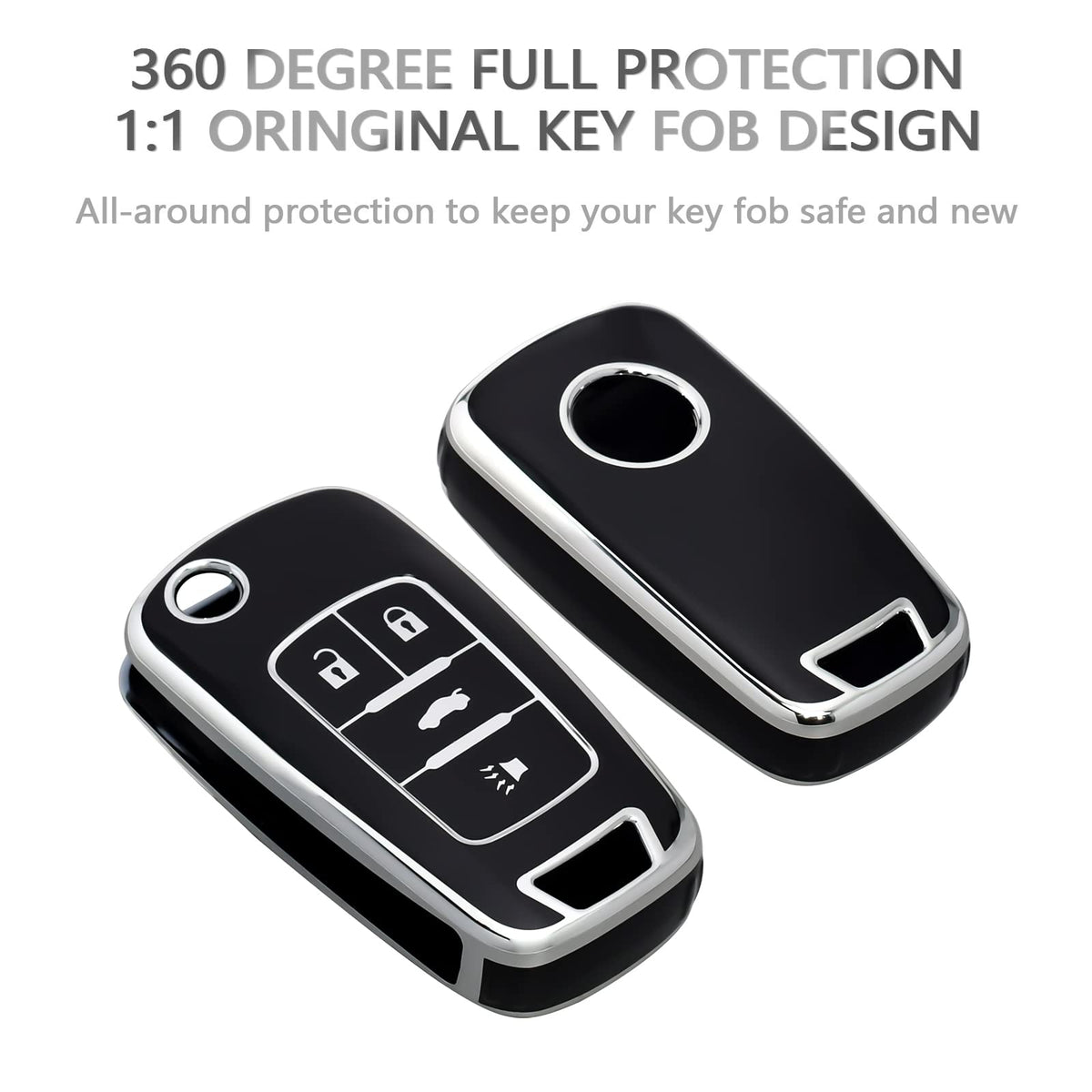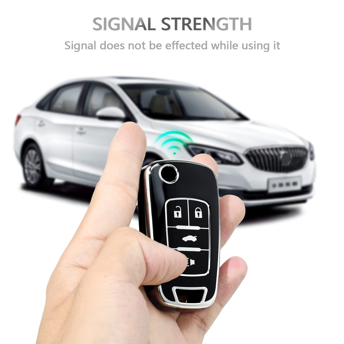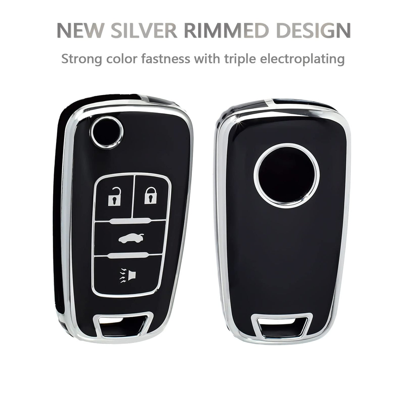 Compatible Models: This car key fob cover is compatible with Buick Encore Chevy Chevrolet Camaro Equinox Impala Sonic Trax GMC Terrain Flip 4 Buttons | Note: Make sure that you order a right cover, please DOUBLE CHECK your key fob with the ads photos before you place the order. If you have any questions about the product, please feel free to contact us with email or asking questions below, we will pleasure to solve it for you. | High Quality Material: The car key case made of premium TPU. It is soft, comfortable and durable for using. Silver edge design made the key case looks fashion and pretty. | Full Protection: Full key fob holder which can 360 degree protect your key well from dust, damage, scratches and rain, which perfect to keep your car key fob safe and new. | No Signal Deduction: The key case protects your key fob all around, but the signal doesn't be affected after using it.