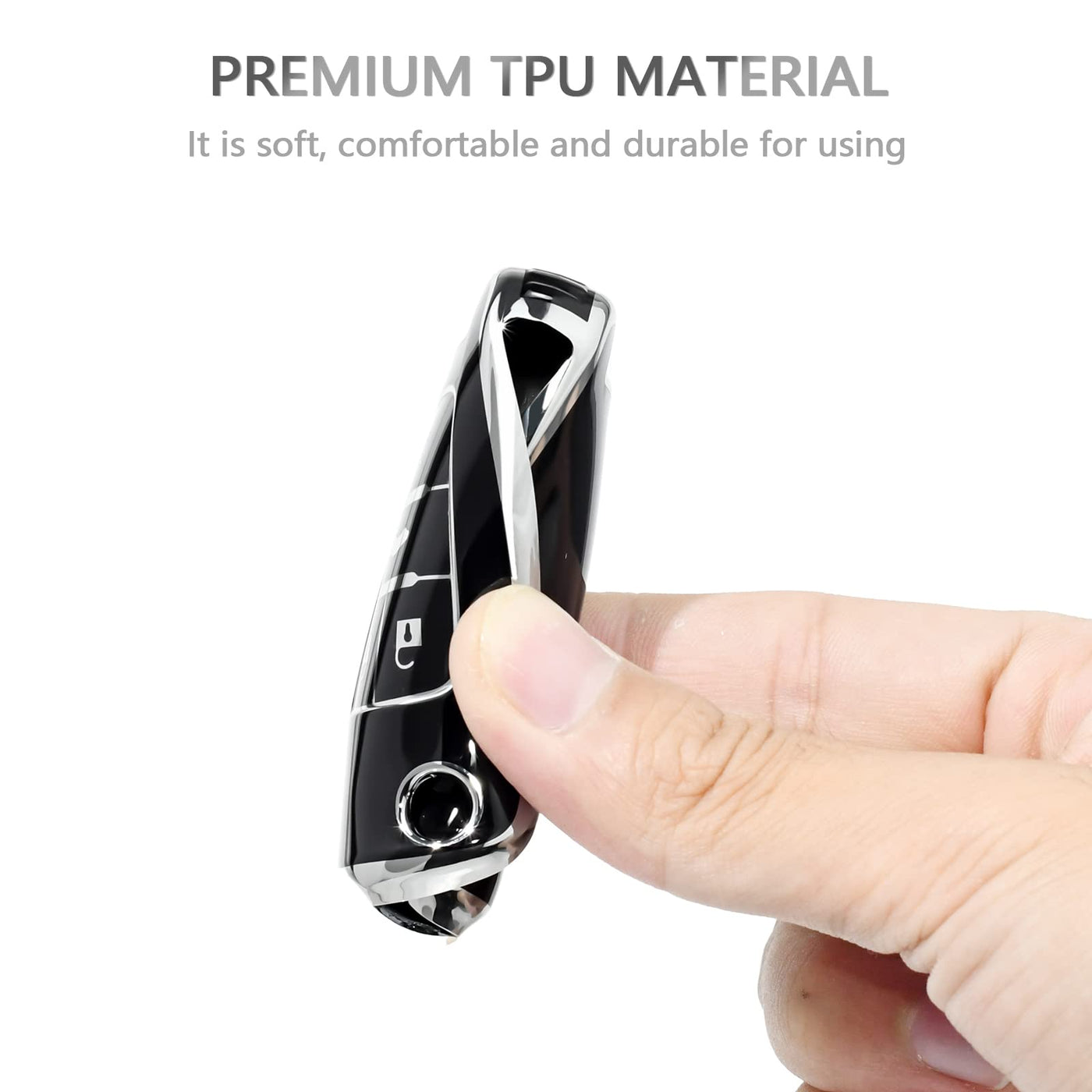 Q: What material is the key fob cover made from?A: The key fob cover is made from high-quality TPU (thermoplastic polyurethane), which is known for being soft, comfortable, and durable. This material provides excellent protection while maintaining a stylish appearance with its silver edge design.