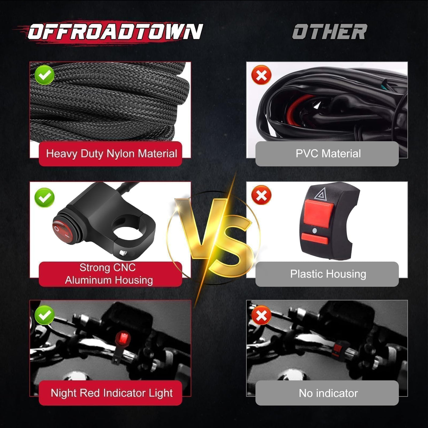 Q: What is the maximum wattage supported by the OFFROADTOWN LED Light Bars Wiring Harness Kit?A: The OFFROADTOWN LED Light Bars Wiring Harness Kit supports a maximum wattage of 120W, making it suitable for powering multiple LED pods or other devices simultaneously.