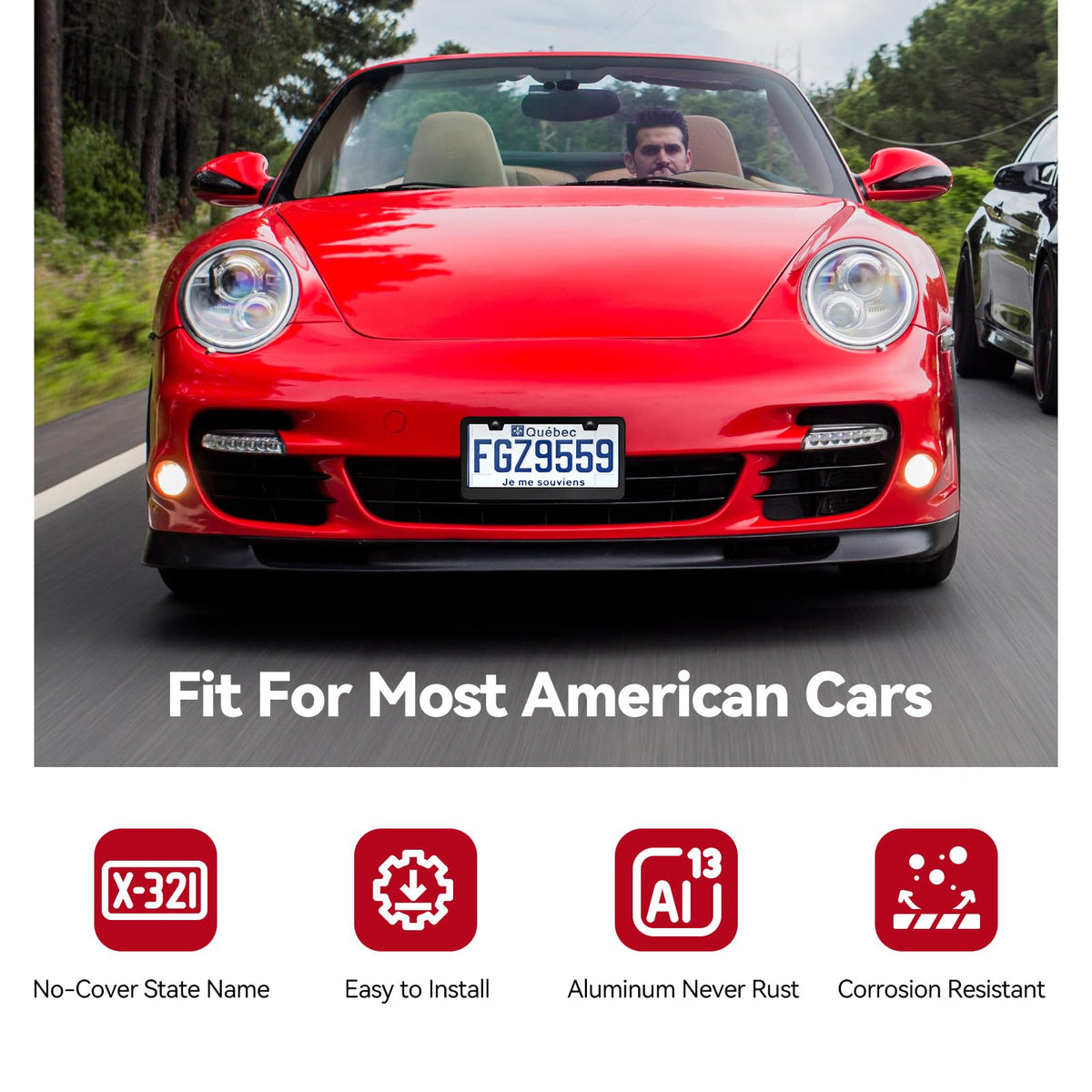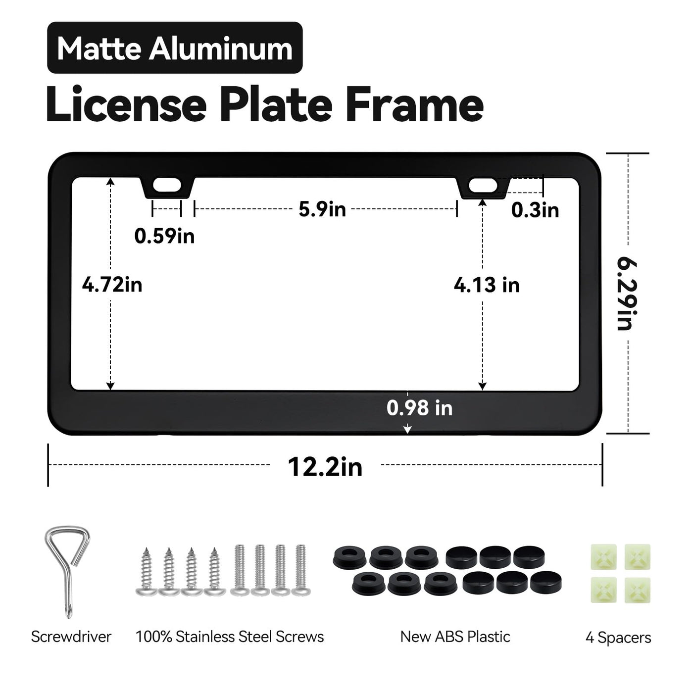 For U.S. License Plate: This Black License Frame size is 6-3/8'' x 12-1/4'' | Strong and Rust-free Plate Frame: Crafted with high quality aluminum, but NOT cheap plastic | Simple installation with vehicle's existing 2 license plate fasteners (screws and matching screw covers included) | This car matte aluminum licence plate frame is designed not to block registration tags in all four corners in most states | Powder coated black matte finish, this 2 holes car licence plate will never peel off | Best Gift: Ohuhu license plate frame is an excellent gift choice for female. Such as birthday, Christmas or any other suitable occasion