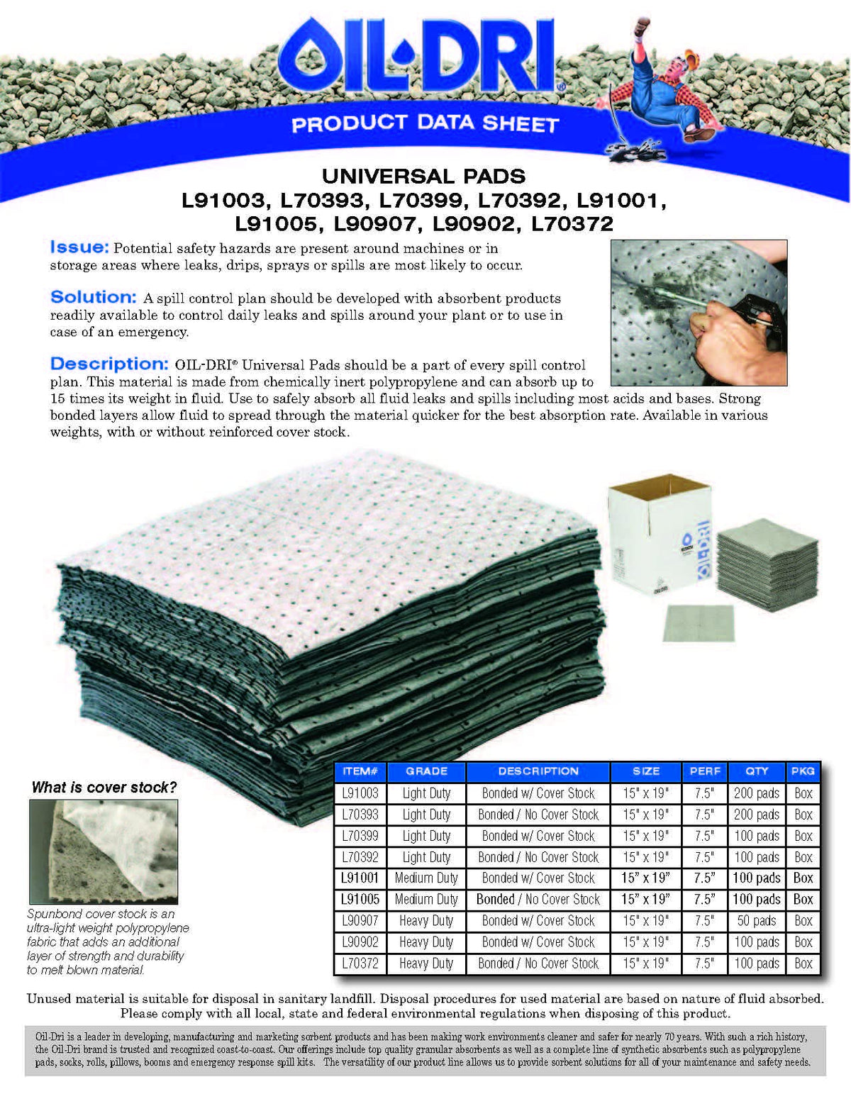 Oil Dri L90902 Universal Heavy Weight Perforated Pads (15'W X 19'L, 100 Pads/Box) Feature Cover Stock For Extra Durability And Bonded Layers For Added Strength And Faster Absorption. Ideal For Aggressive And Non-Aggressive Leaks And Spills In Maintenance Bays, Work Stations, And Routine Industrial Applications. Absorbs Up To 30 Gallons Per Box.