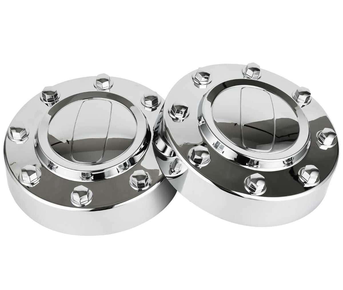 Q: What are the dimensions of the front and rear hub caps?A: The front cap diameter measures 9 1/4 inches with a height of 2 3/4 inches, while the rear cap diameter is also 9 1/4 inches with a height of 4 1/4 inches. Ensure these dimensions match your vehicle's specifications before purchasing.