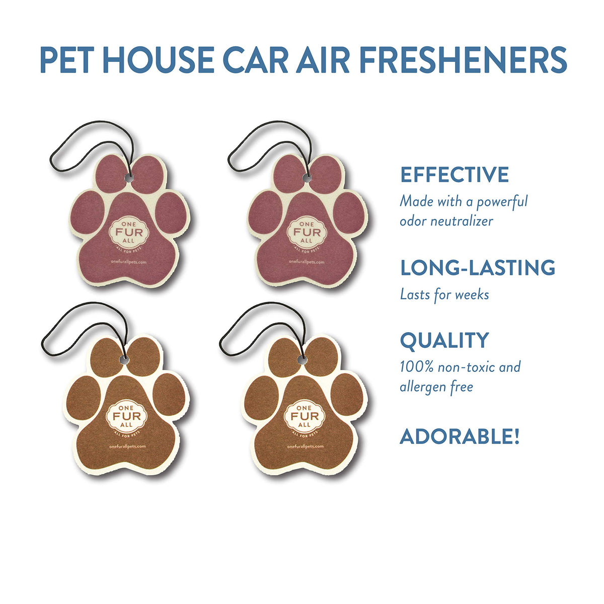 Pet House Car Fresheners will make every car and small space smell amazing. Even if your car doesn't smell like your pet, Pet House Car Freshener makes every car, boat, closet and any small space smell fresh and clean. Pet House Car Fresheners include the powerful combination of an effective odor neutralizer, the highest quality fragrances and natural essential oils. Pet House Car Freshener's paw shape is adorable and make a great gift for any pet parent. Pet House Car Fresheners are COMPLETELY NON-TOXIC and allergen-free. Pet House Car Fresheners are made in the USA. One Fur All has developed a line of pet-friendly products made to freshen pet-loving homes and cars. Infused with our signature blend of essential oils and leading odor neutralizer, our products give long-lasting results for pets and pet owners. Make your home smell great! Features: Specially formulated to freshen pet-loving cars Ideal for smaller spaces Made with the leading odor neutralizer Non-toxic and 100% dye-free Made in the USA Package Includes: 1 x Pet House Car Air Freshener - Pack of 4