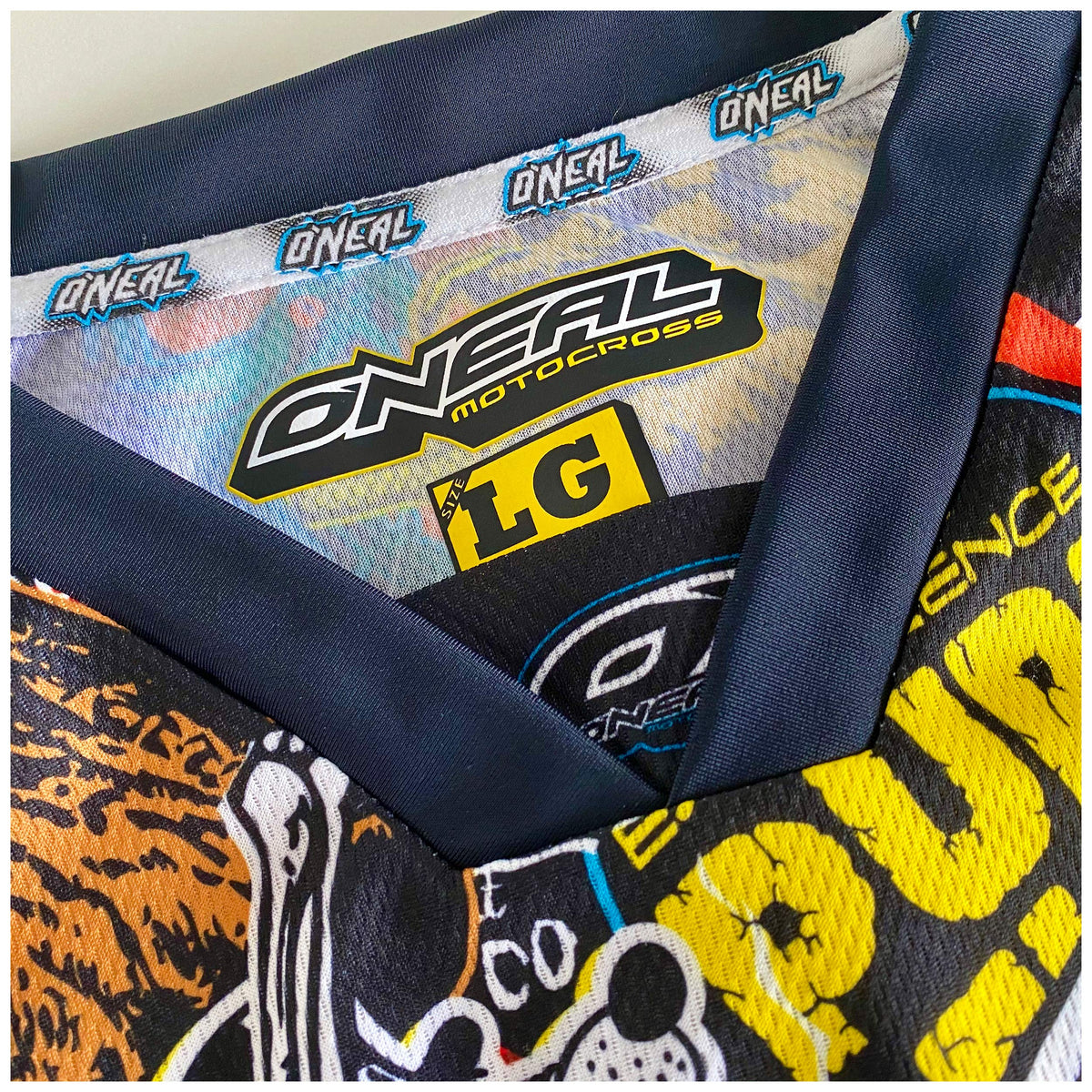 Q: How should I care for my O'Neal Mens V-neck Shirt to maintain its quality?A: To maintain the quality of your O'Neal Mens V-neck Shirt, it's recommended to machine wash it in cold water and hang it to dry. Avoid using bleach or fabric softeners, as these can damage the sublimated graphics and overall fabric integrity.