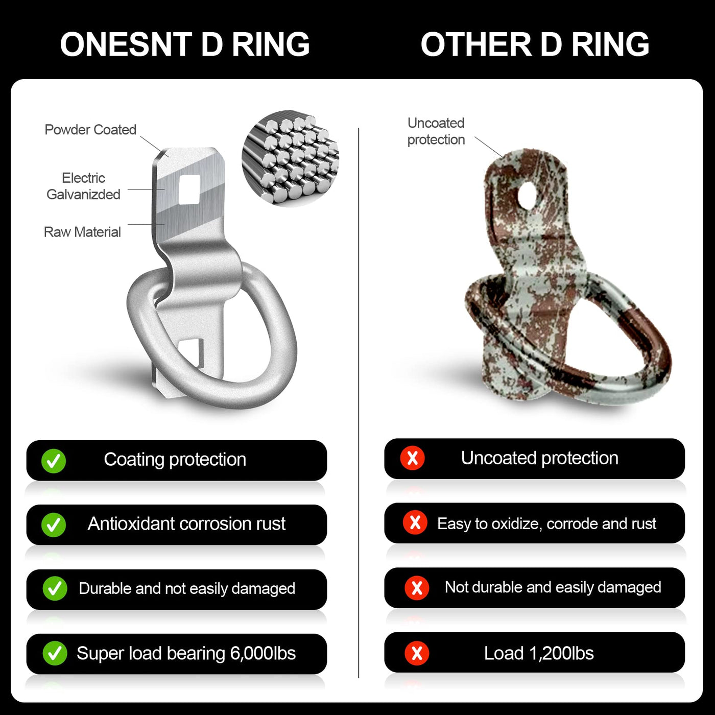 Q: What materials are the D-Rings made of?A: The Onesnt D-Rings are constructed from high-strength forged alloy steel and are protected by a durable zinc-plated finish to prevent rust.