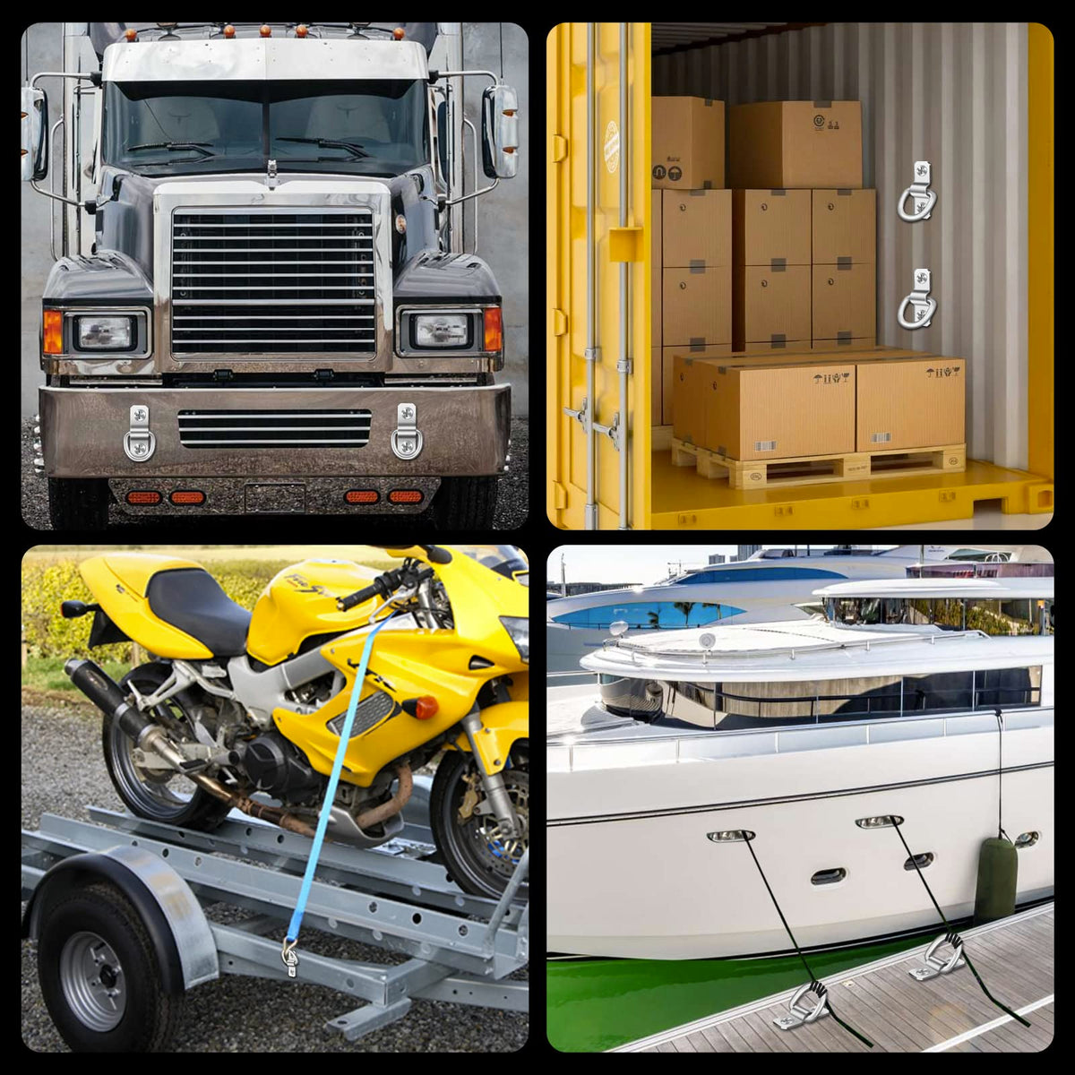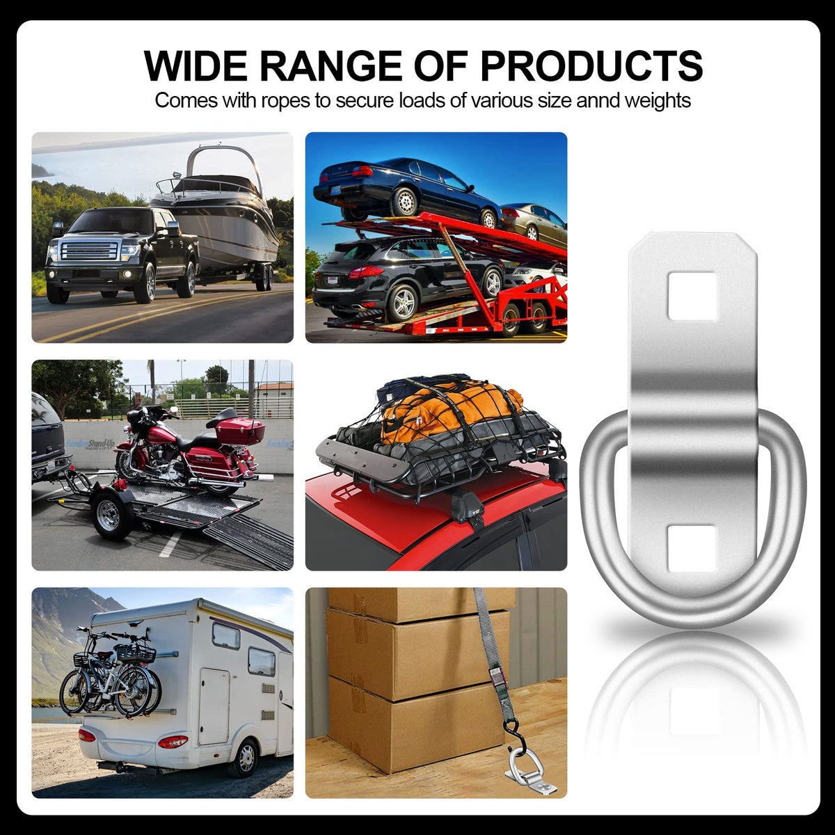 Q: What applications are these D-Rings suitable for?A: These D-Rings are versatile and can be used for securing loads on trucks, trailers, boats, RVs, and vans. They are ideal for anchoring motorcycles, kayaks, and other equipment during transport.