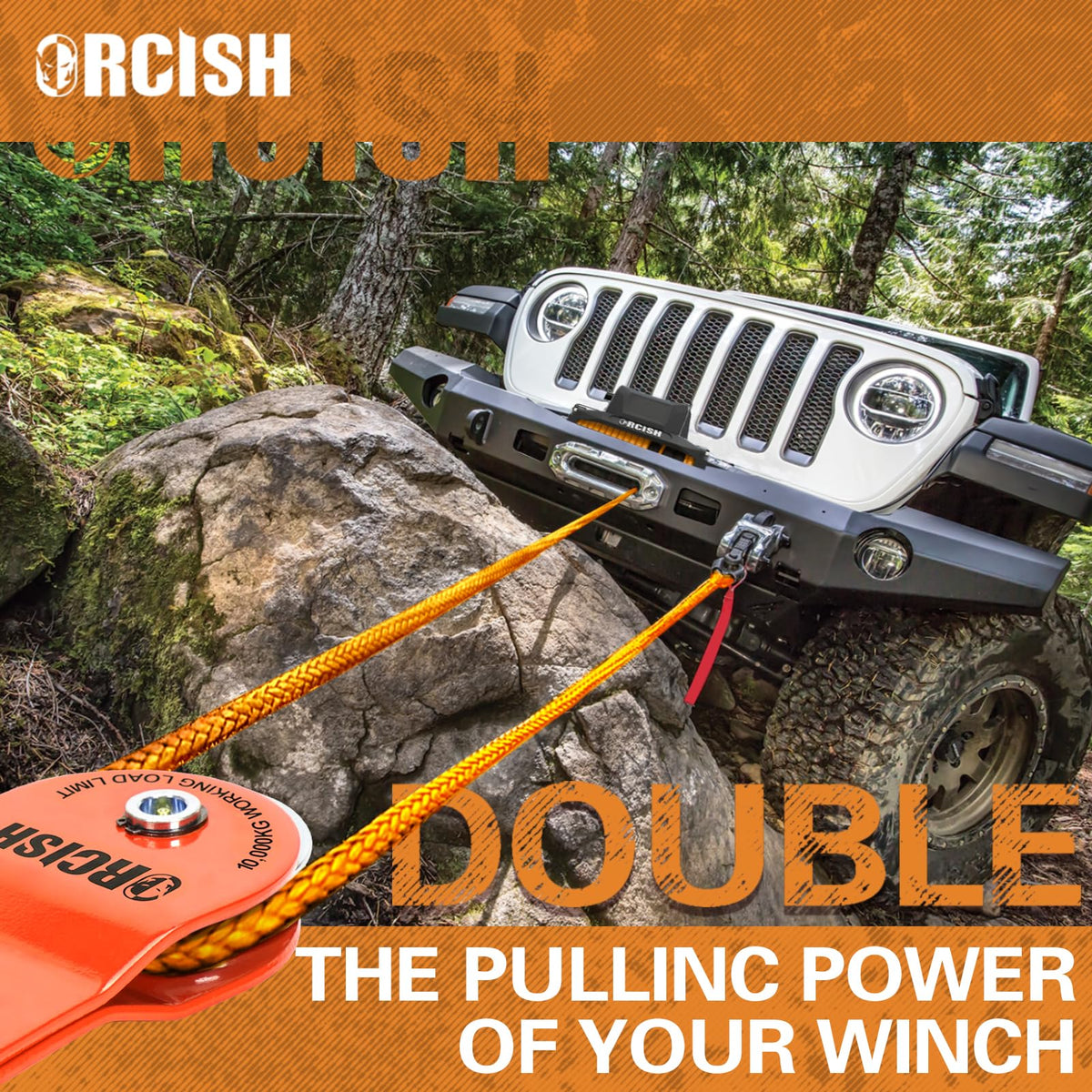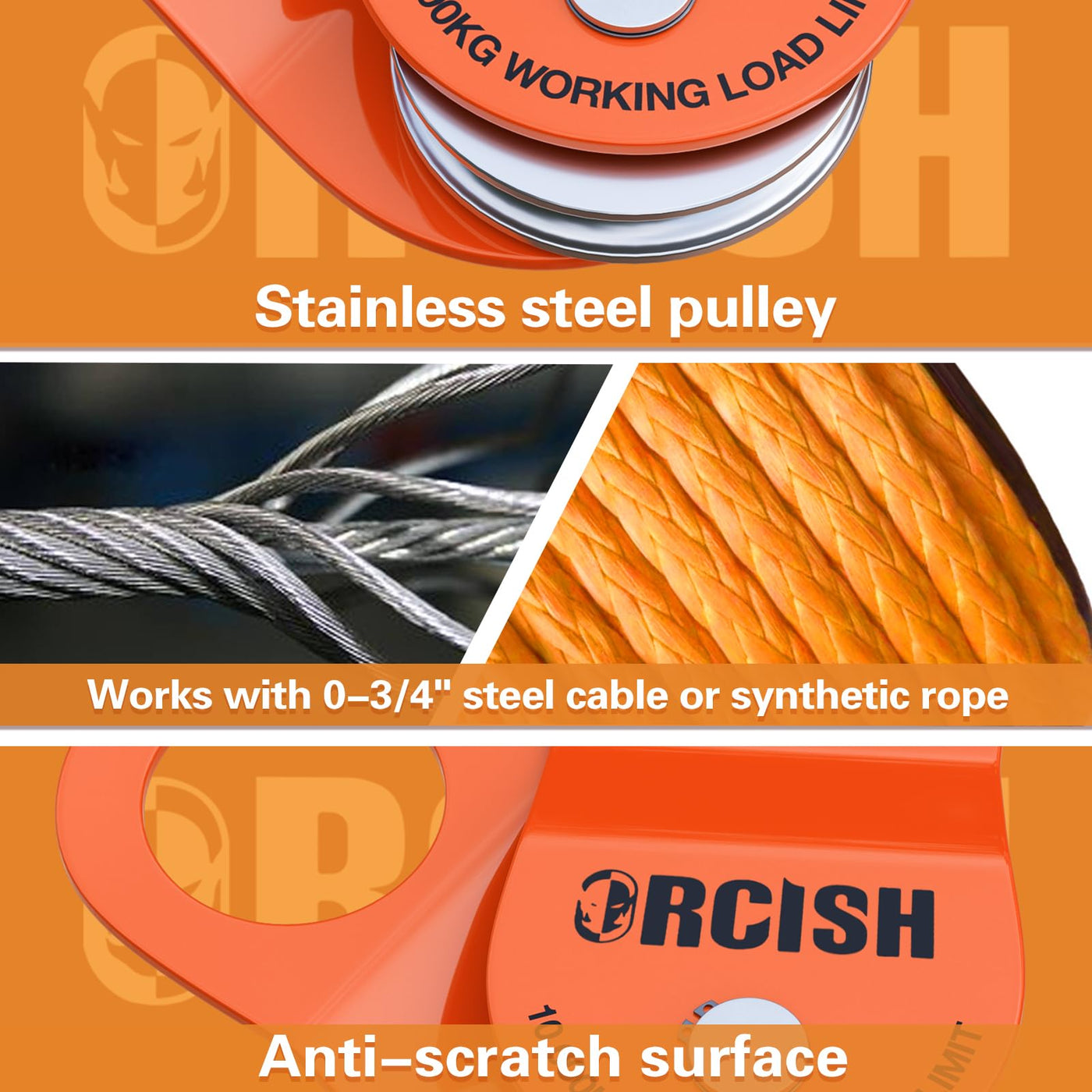 Q: What materials are used in the construction of the ORCISH Snatch Block?A: The ORCISH Snatch Block is made of heavy-duty steel and features anti-corrosion coatings to ensure durability and longevity in rugged conditions.