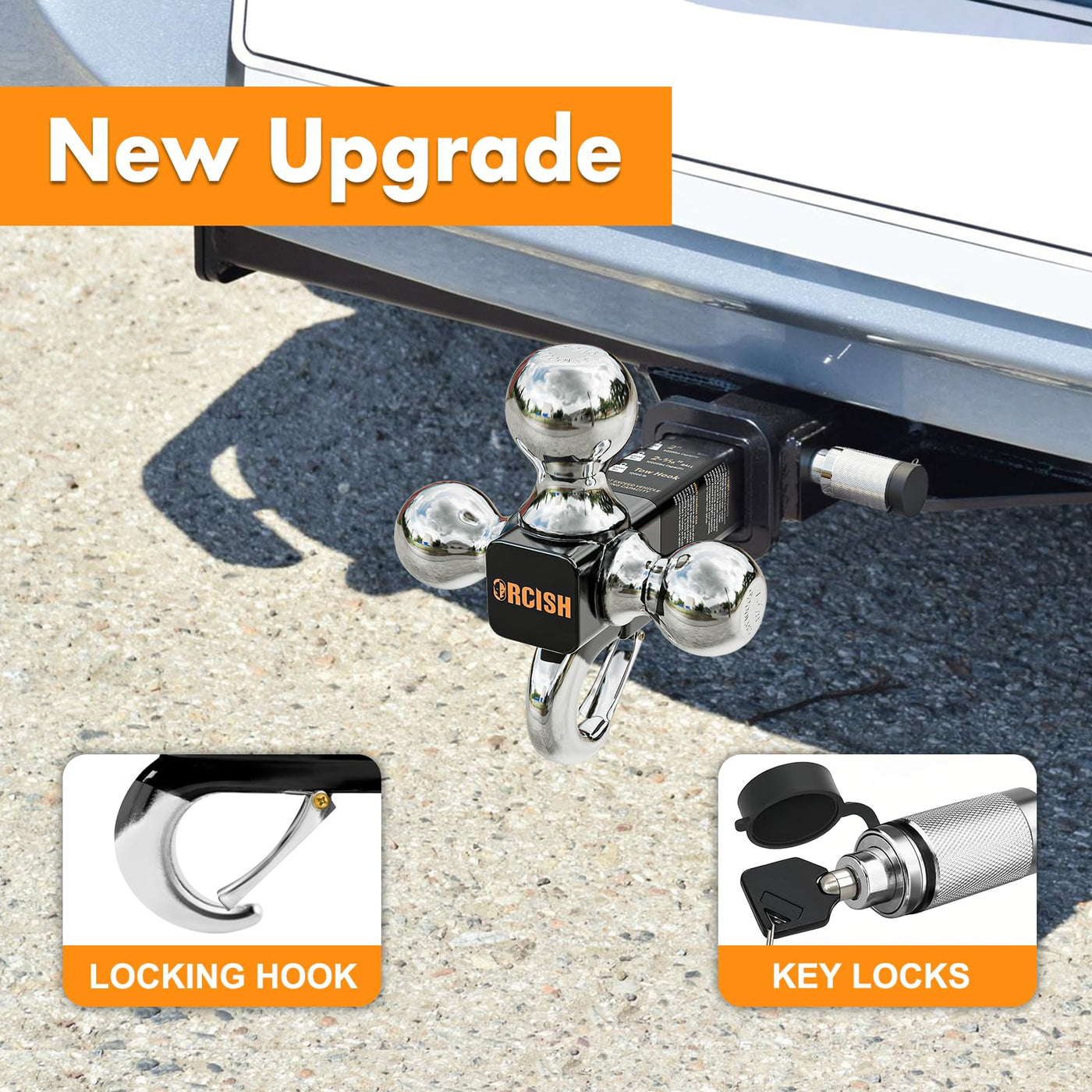 Orcish Trailer Hitch Tri-Ball Mount With Hook Contain Secure Self-Lock Latch, Trailer Ball Size 1-7/8'', 2'' And 2-5/16'', Fit 2