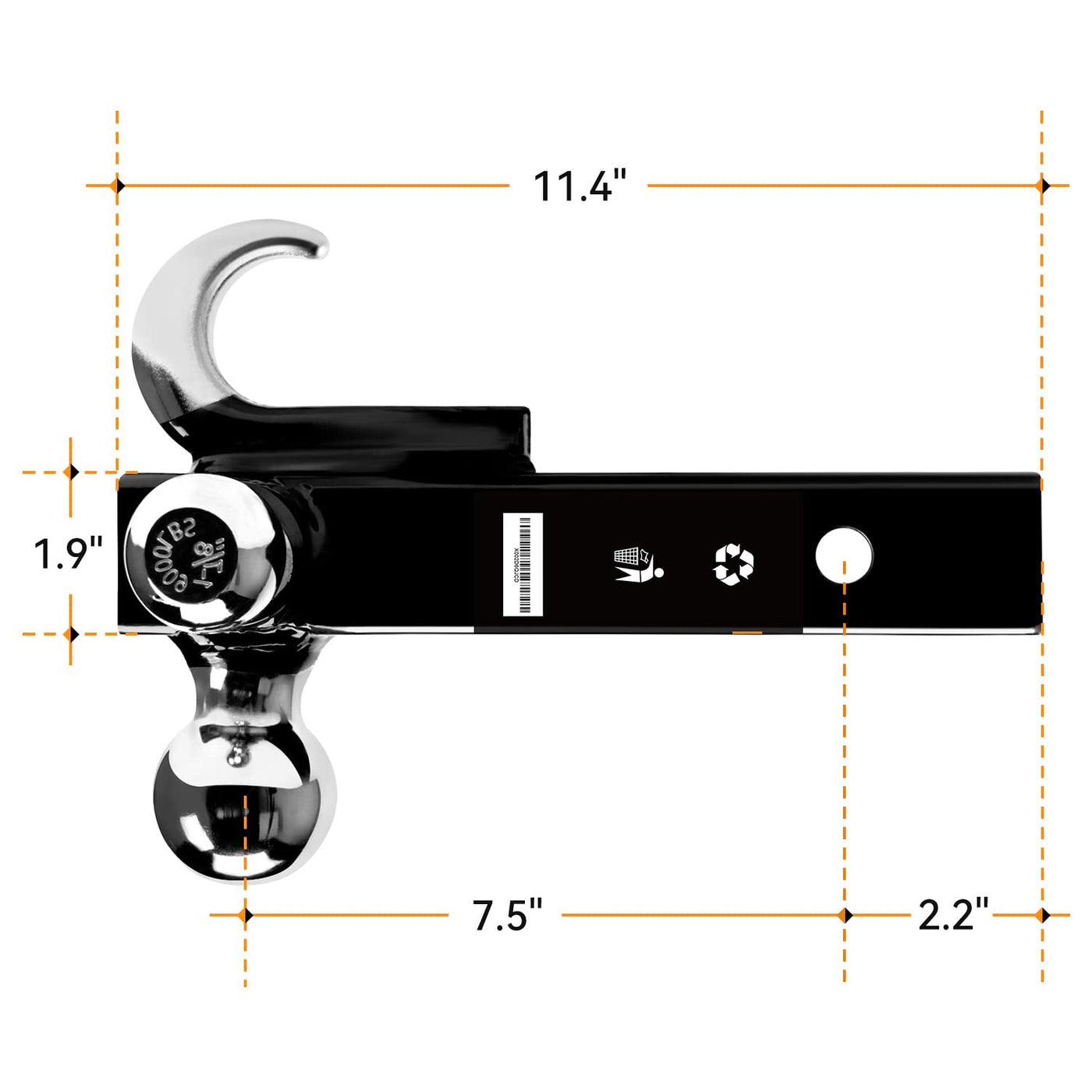 Q: Is the ORCISH Trailer Hitch suitable for heavy towing?A: Yes, the ORCISH Trailer Hitch features heavy-duty construction with ball weight capacities of 5,000 lbs for the 1-7/8" ball, 6,000 lbs for the 2" ball, and 10,000 lbs for the 2-5/16" ball, along with a tow hook capacity of 10,000 lbs.
