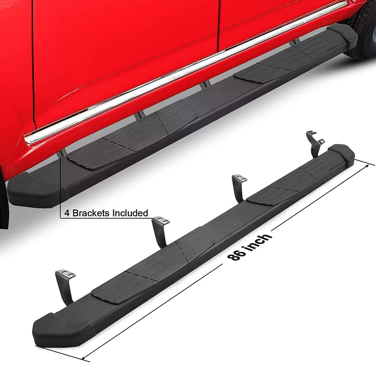 Q: What materials are the running boards made from?A: These running boards are constructed from heavy-duty galvanized carbon steel and feature anti-slip plastic step pads. The surface is coated with a double rust-proof black powder finish, enhancing durability and resistance to rust.