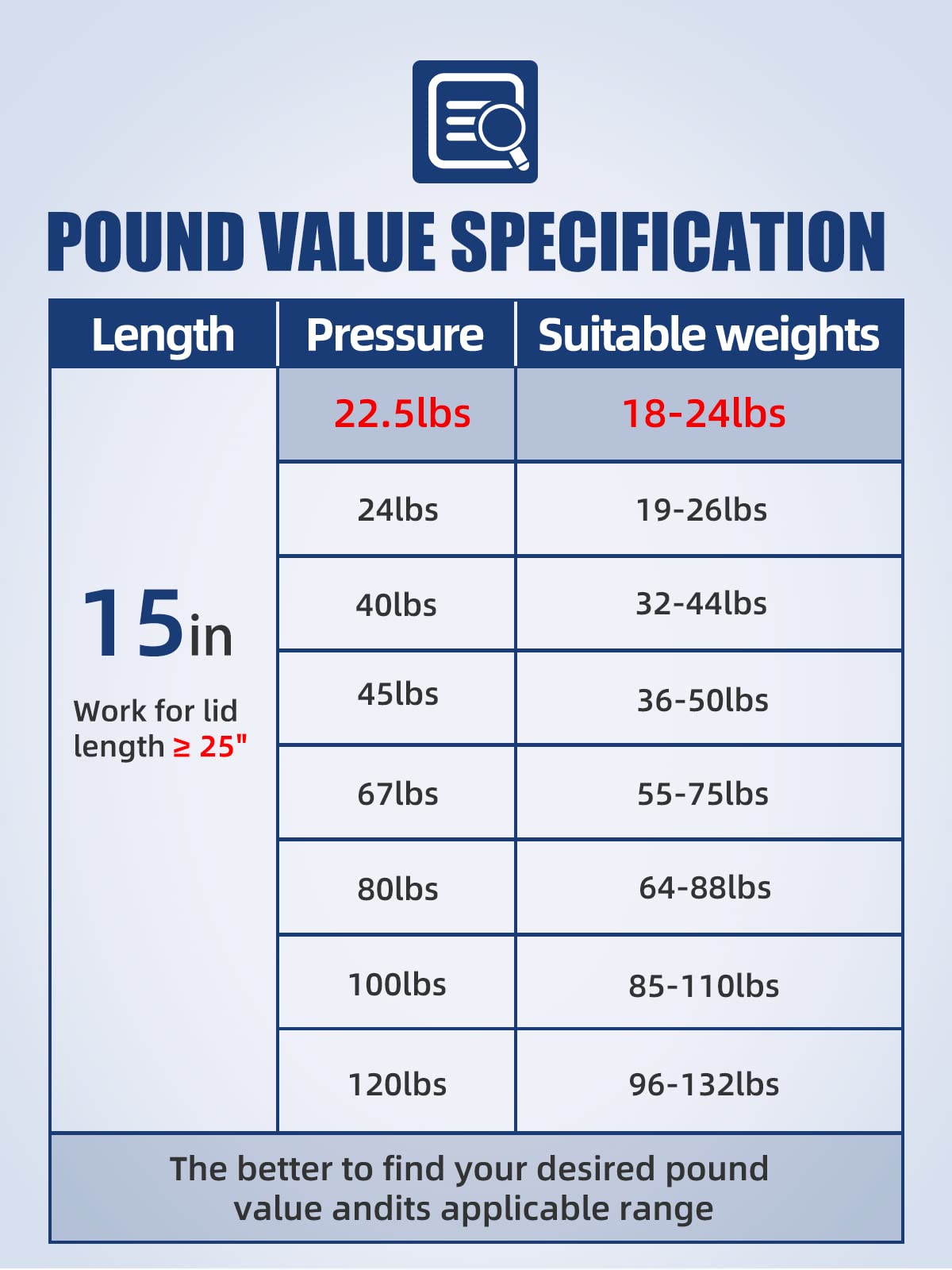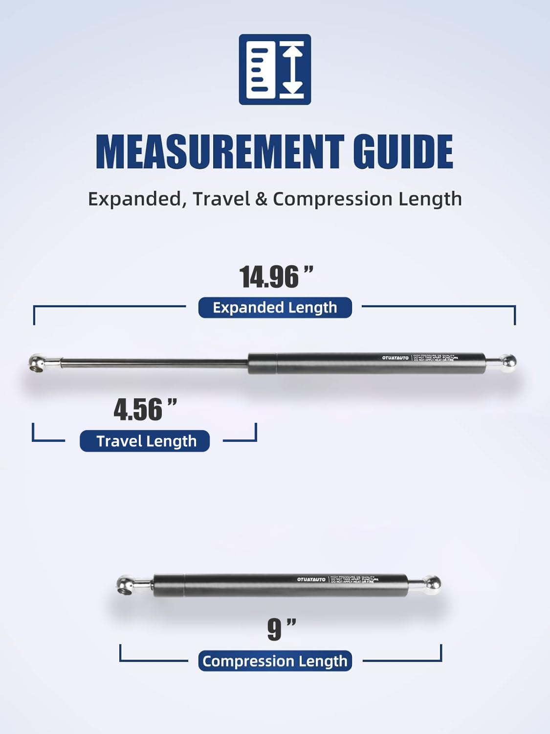 Q: What are the specifications for the OTUAYAUTO gas struts?A: Each OTUAYAUTO gas strut has an extended length of 9.6 inches and a compressed length of 6.2 inches, with a force rating of 100N (22.5 lbs) per shock, making them suitable for loads within the range of 17 lbs to 26 lbs.
