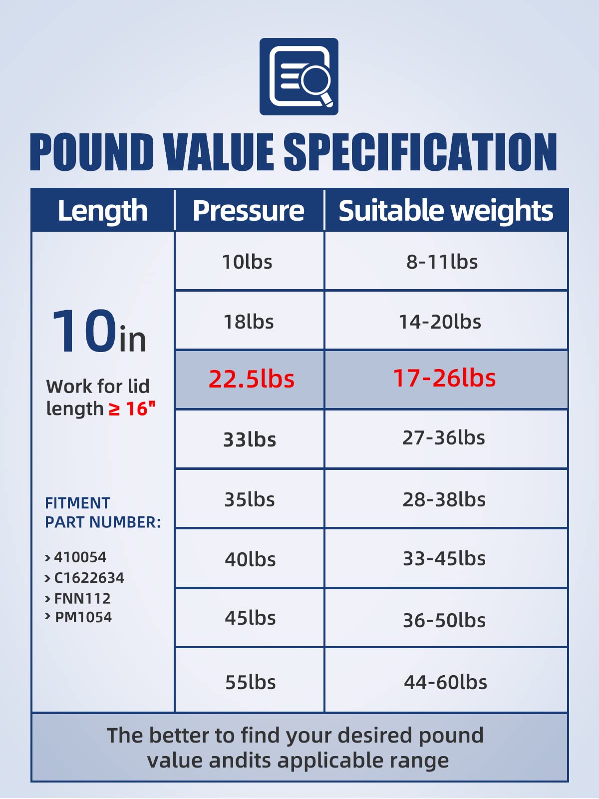 Q: What is the weight capacity of the OTUAYAUTO gas struts?A: Each OTUAYAUTO gas strut has a force of 100N (22.5 lbs), which means that a pair can support a total weight of 200N (45 lbs). It is important to use these struts within their specified weight range of 17 lbs to 26 lbs for optimal performance.