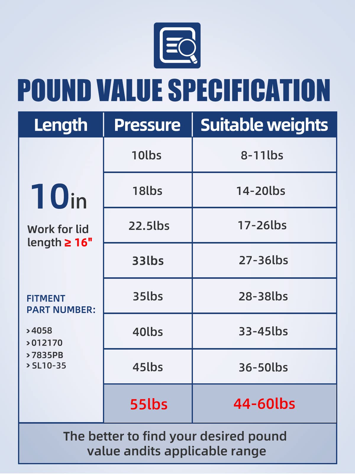 Q: What weight can the OTUAYAUTO gas struts support?A: Each gas strut provides a force of 245N (approximately 55 lbs), and when used as a set, they can support up to 490N (approximately 110 lbs).