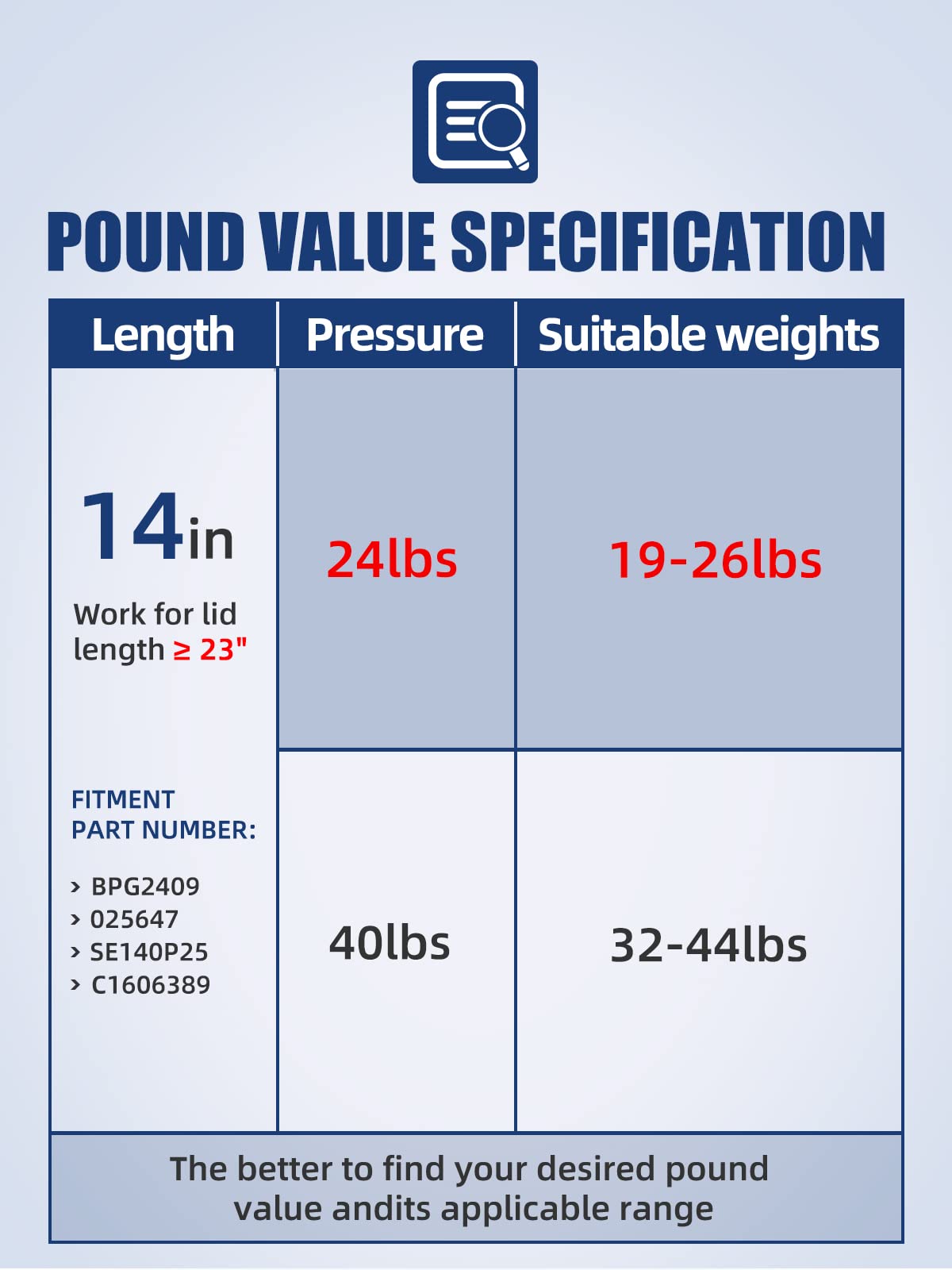 OTUAYAUTO Parts & Accessories When you want to get OEM quality without the high dealer cost, OTUAYAUTO is the right choice for you. Today you can fix your vehicle properly and have money left in your pocket with a OTUAYAUTO product. please check the description and compatibility chart before your purchasing Specificationse Size: 14 Inch Lift Supports Force: 107N/24Lbs (Per Strut), 214N/48lbs (Per Set) Extended Length (Center-to-Center): 13.98 inch Compressed Length (Center-to-Center): 8.90 inch Package: 2Pcs 24lbs/Per Shock Fitment: household cabinet, hatch lid, generator house cover, trash bin lid, loft floor hatch, outdoor bench lid, trap door, garbage shed lid, camper shell window, teardrop trailer, dog house/hen house cover, and so on. Note: Inclued 2pcs struts in the package, NOT JUST 1 !!! Fit the cover or door or lid which the side length is more than 32 inch. If your door/lid is less than 12 lbs, please choose less-pressure lift struts. If your door/lid is about 14-20 lbs, you can just install ONE strut. If your project is about 24-40 lbs, you can just install BOTH struts. If your project is larger than 48 lbs, please choose stronger-pressure lift struts or install more than 2 struts. The pressure could be adjusted to stronger/weaker when you adjust the mounting points opposites/towards the hinge direction on the lid.