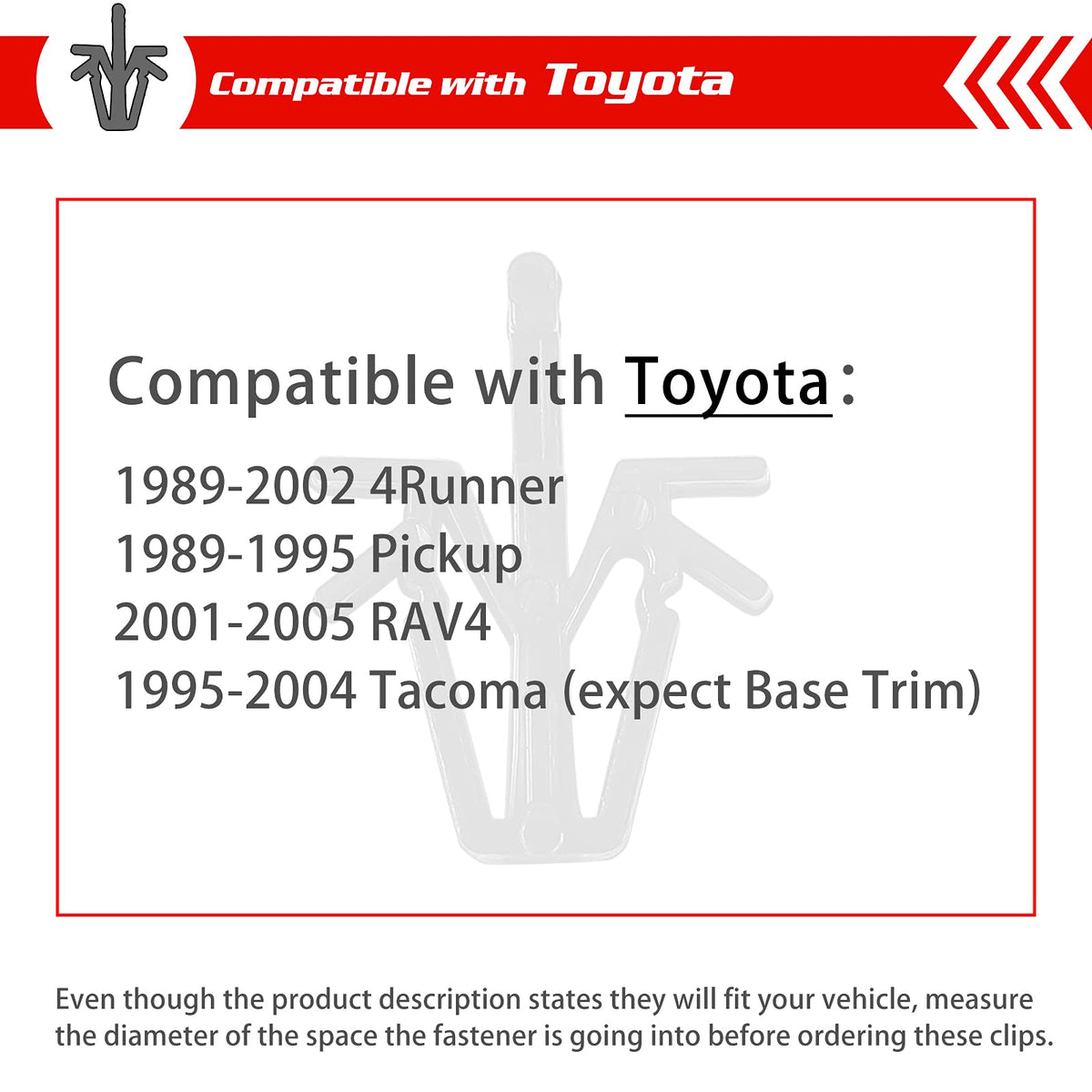 Car Grill Clips ensure that your car's body panels are free from dirt and moisture, efficiently saving them from corrosion and deformation. OTUAYAUTO Advanced Nylon Grill Clips Vehicle Fitment: Compatible with Toyota Compatible with 1989-2002 Toyota 4Runner Compatible with 1989-1995 Toyota Pickup Compatible with 2001-2005 Toyota RAV4 Compatible with 1995-2004 Toyota Tacoma (expect Base Trim) Package includes: 30PCS Grill Clips 30pcs car clips complete your parts and accessories stock. When you break one, then you don't have to go down to your local automotive shop. Don't use every day, but when you need them, its handy to have good clips on hand.