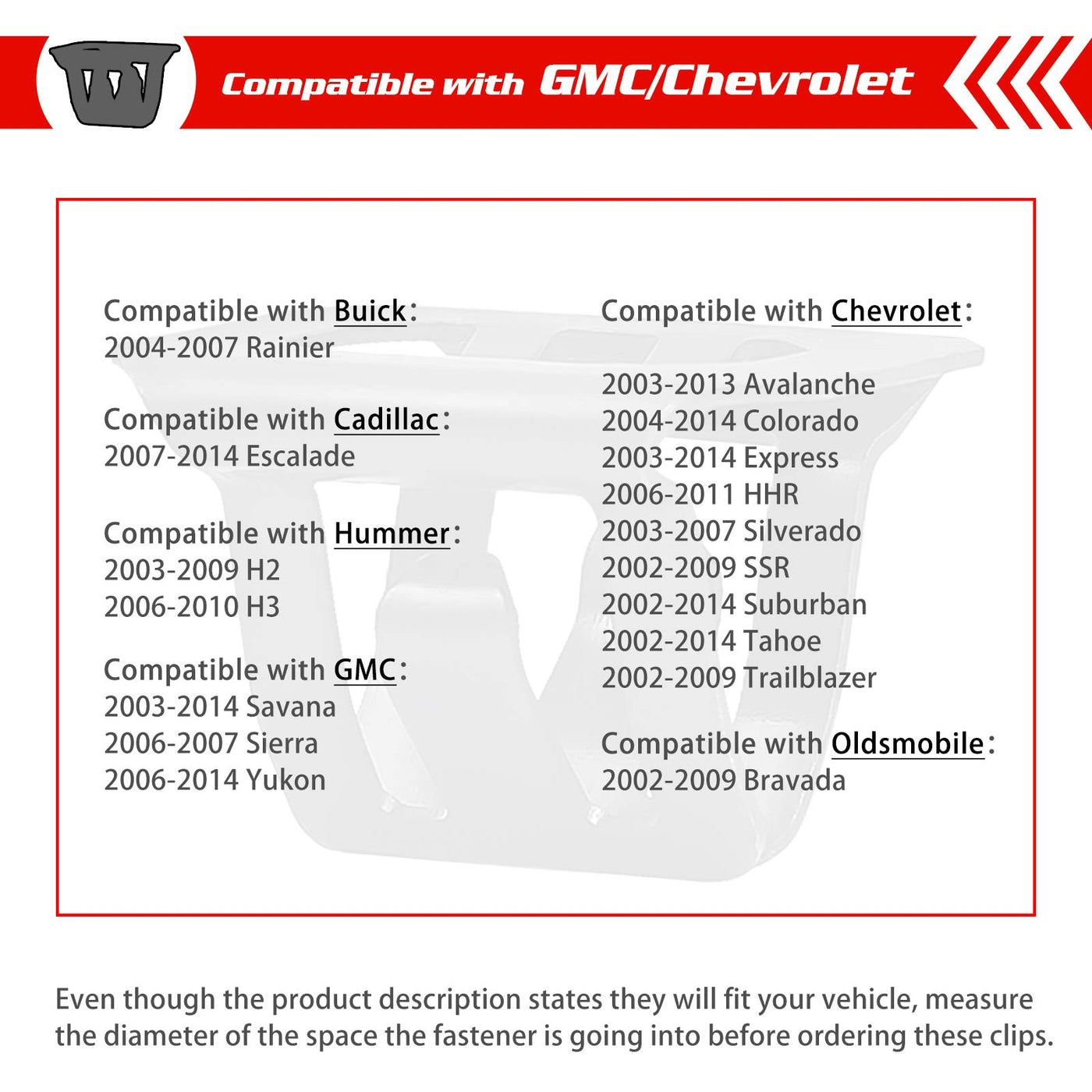 Car Clips Fitment Compatible with 2004-2007 Buick Rainier Compatible with 2007-2014 Cadillac Escalade Compatible with 2003-2013 Avalanche Compatible with 2004-2014 Colorado Compatible with 2003-2014 Express Compatible with 2006-2011 HHR Compatible with 2003-2007 Silverado Compatible with 2002-2009 SSR Compatible with 2002-2014 Suburban Compatible with 2002-2014 Tahoe Compatible with 2002-2009 Trailblazer Compatible with 2003-2014 GMC Savana Compatible with 2006-2007 GMC Sierra Compatible with 2006-2014 GMC Yukon Compatible with 2003-2009 Hummer H2 Compatible with 2006-2010 Hummer H3 Compatible with 2002-2009 Oldsmobile Bravada Package Includes: 30pcs Grill Clips OTUAYAUTO Advanced Car Clips Advantage: 1. The quality seems to be as good as the OEM ones. 2. Super cheap, it is a small fraction of the price the dealer and auto parts stores wanted. 3. You will be glad you have them, because when you break one, then you don't have to go down to your local automotive shop. 4. Your satisfaction is our utmost concern. Please contact us to resolve any issue