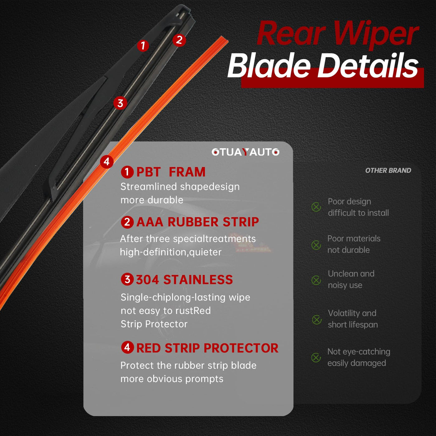 Q: What materials are used in the OTUAYAUTO wiper blade?A: The wiper blade is made of precision-cut natural rubber, which ensures a quieter operation and effective clearing of water and debris from the rear windshield.