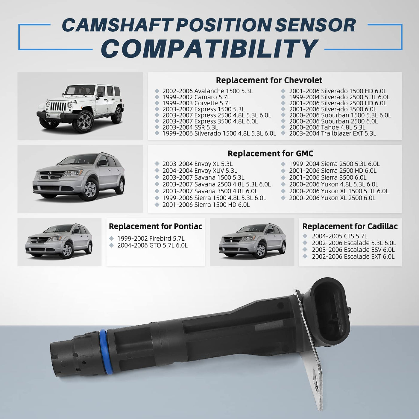 Q: What vehicles are compatible with the OTUAYAUTO Camshaft Position Sensor?A: The OTUAYAUTO Camshaft Position Sensor is compatible with a variety of vehicles including the 2002-2006 Chevrolet Avalanche 1500, 1999-2002 Camaro, 1999-2003 Corvette, and multiple models of the Chevy Express, Silverado, Suburban, and Tahoe from 1999 to 2007. It also fits GMC models like the Envoy and Sierra, Cadillac Escalade models from 2002 to 2006, and Hummer H2 from 2003 to 2007.