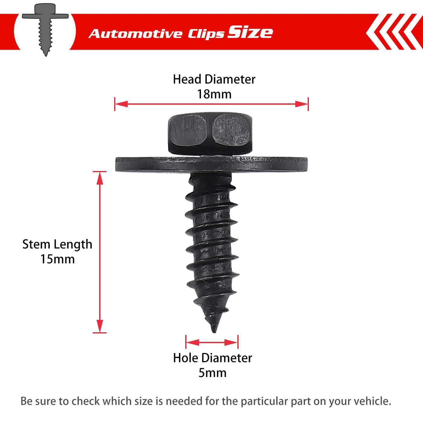 Q: What is the size and material of these screws?A: These screws measure M4.8-1.61 x 16mm (approximately #10 x 5/8"), with a top head diameter of 8mm and a bottom head diameter of 18mm. They are made from high-quality black metal, ensuring durability and a secure fit for your vehicle's protective shields.