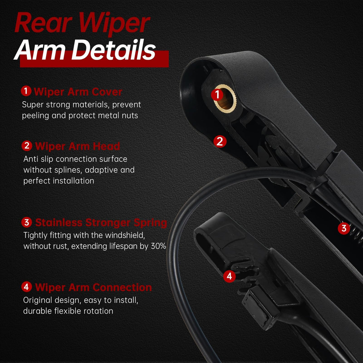 Q: What materials are used in the wiper blade and arm?A: The OTUAYAUTO Rear Wiper Arm and Blade are made from high-quality materials, including a rubber strip that has undergone three special treatments for durability, wear-resistance, and quiet operation.