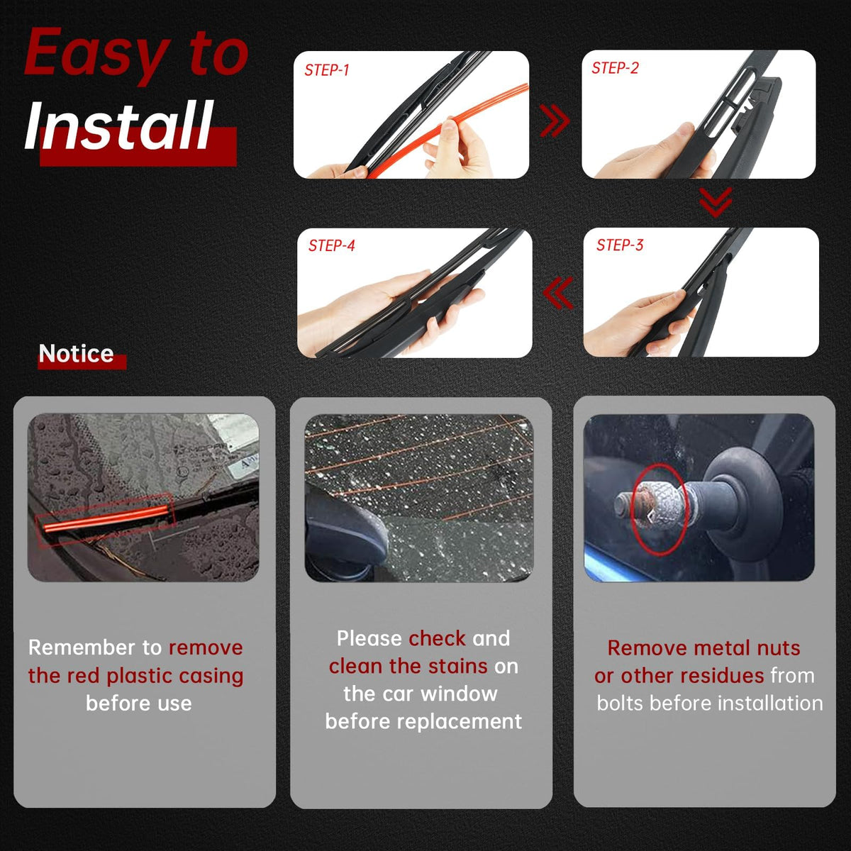 Q: How do I install the rear wiper arm and blade?A: Installation is straightforward: 1. Joint the wiper arm with the cross-pillar in the middle of the wiper blade. 2. Position it vertically to allow the wiper arm to fit into the blade. 3. Finally, install the entire kit onto the window. Make sure to remove any plastic or metal from the wiper motor shaft before installation.