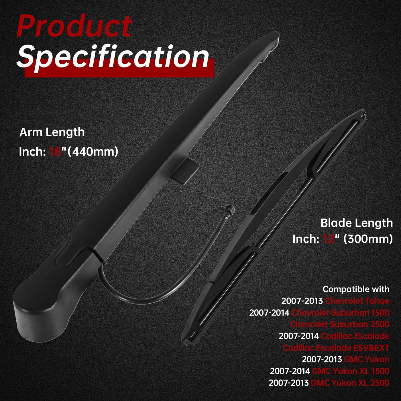 Please Check The Picture Carefully To Make Sure That The Part Is What You Need. Replacement Rear Wiper Arm Attachment With Cover Cap And Wiper Blade. The Joint Between Wiper Blade And Wiper Arm Is Consistent With The Original Car. Perfect Item For Keeping The Rear Windshield Clear Of Water And Debris. Direct Replacement, Easy Installation. Fitment: Replacement For 2007-2014 Chevrolet Tahoe Replacement For 2007-2014 Chevrolet Suburban Replacement For 2007-2014 Cadillac Escalade Replacement For 2007-2013 Gmc Yukon Specifications: Package Includes: 1X Wiper Arm & Cover 1X Wiper Blade Size: Blade Length: 12''(300Mm) Installation: 1. Joint The Wiper Arm With The Cross-Pillar, Which Is In The Middle Of The Wiper Blade. 2. Put In Vertical Direction. The Wiper Arm Would Be Stuck In The Blade. 3. Install The Whole Kit In The Window. Done Note: Make Sure All Plastic/ Metal Is Removed From The Wiper Motor Sharf Before Installation! ( As Picture Shown Above) * Note: Please Read All Description & Size Before Ordering The Product. Your Satisfaction Is Our Utmost Concern. Please Contact Us To Resolve Any Issue Before Leaving Any Neutral Or Negative Feedback.
