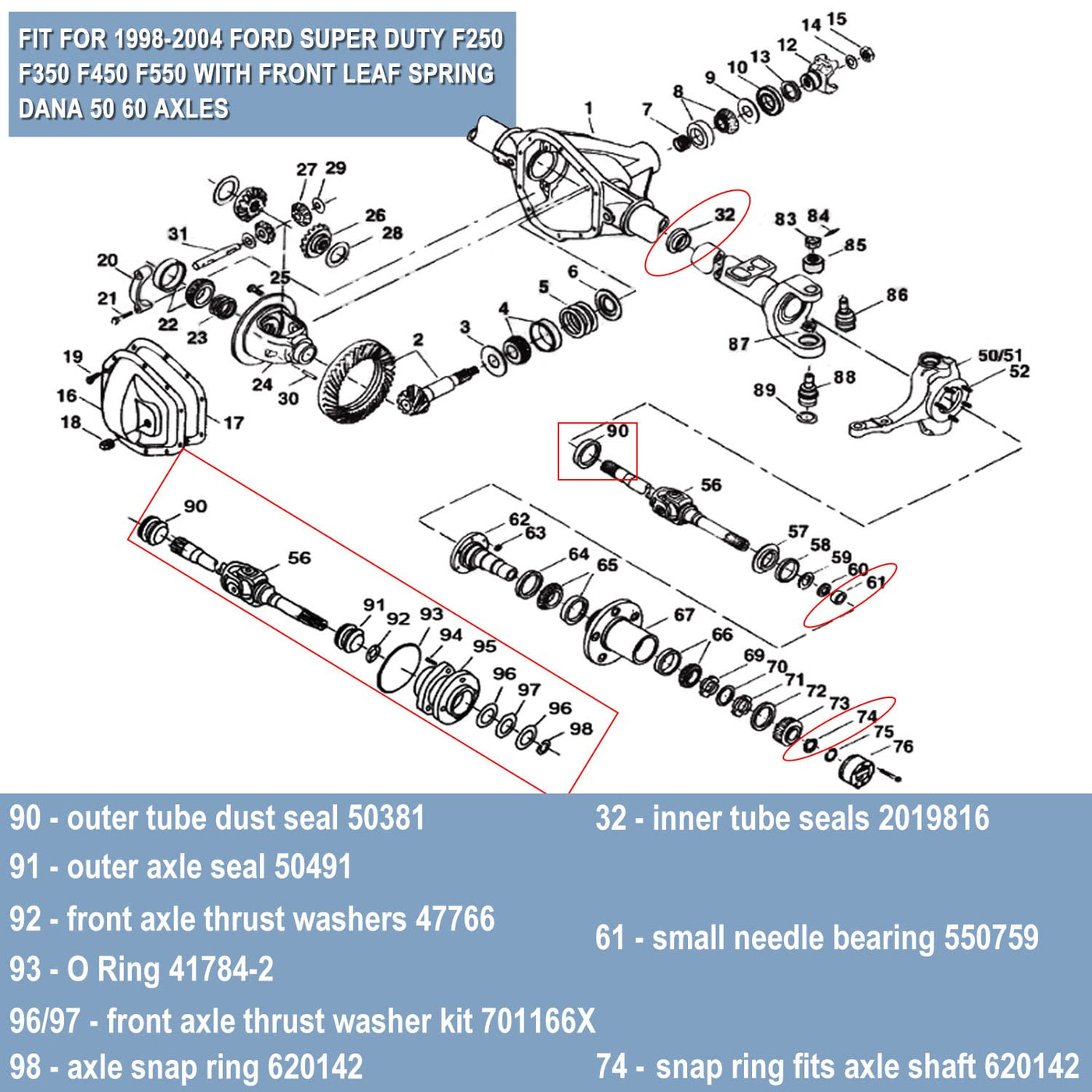 APPLICATION: The outer axle bearing seal kit & tube seal kit & snap ring thrust washer kit is compatible with Ford Super Duty Excursion F250 F350 F450 F550 Dana 50 60 front with leaf spring front suspension, made 1998-2004.