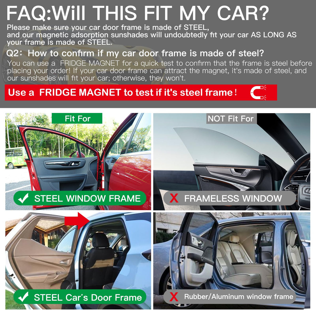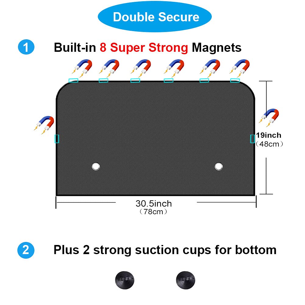Still worrying about sun exposure, interior aging, baby rest, privacy, etc.? Ovege car Window shade is a great solution for you! Features: ?You can still roll down your windows when driving and let air come in. ?DOUBLE SECURE--Besides 8 strong magnets per unit, we have added two extra Strong Suction Cups to better hold the bottom of the Car window screen. You can choose to use it or not. ?Fast & Friendly Customer Service-We're standing by ready to help! Our priority is excellent customer service, so please reach out and we will do everything we can to help. Specification: Material: Premium Mesh Size: 19 inch* 30.5 inch(48cm*78cm) Packing lists: 2pcs Side Window Shade (Back Seat) (With 8 magnets sewn inside the hem per piece) 4 Strong Suction cups Tips--If the suction cup is deformed due to transport of delivery, please kindly put the suction cup in the hot water for a few minutes, then it will restore the original shape. Thank you. Installation Method: Find the top hem with the magnets sewn in. Attach the sunshades to the window frame or the door frame. Done! Note: Only applicable for the metal frame! Not applicable for the frame which is made in aluminum or plastic! Our sunshades are universal, so it may not cover all the area of your windows. Please pay attention to it before you order it.