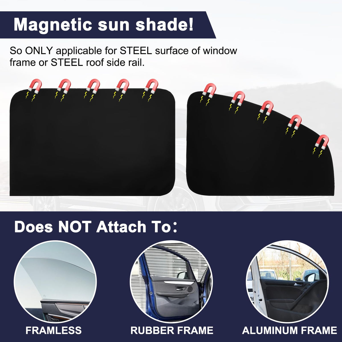 ???UV PROTECTION ?--Ovege Car Shades for Back Windows Baby is made of high density selected Suedette, it can block harmful UV Rays. Protect your children and family from sun glare, heat, and harmful UV rays. Make the interior of the car MUCH COOLER! A must-have for your road trip. ???PROTECT PRIVACY?-Our car window shades for side window are opaque, so you can use your car as a private room now.You will be totally free in your own car. Do whatever you wanna do. We wish we have met you earlier. ???FAST & EASY INSTALLATION?--Strong Suction Magnetic, installation within 3 seconds! Save your time and bring you great convenience.