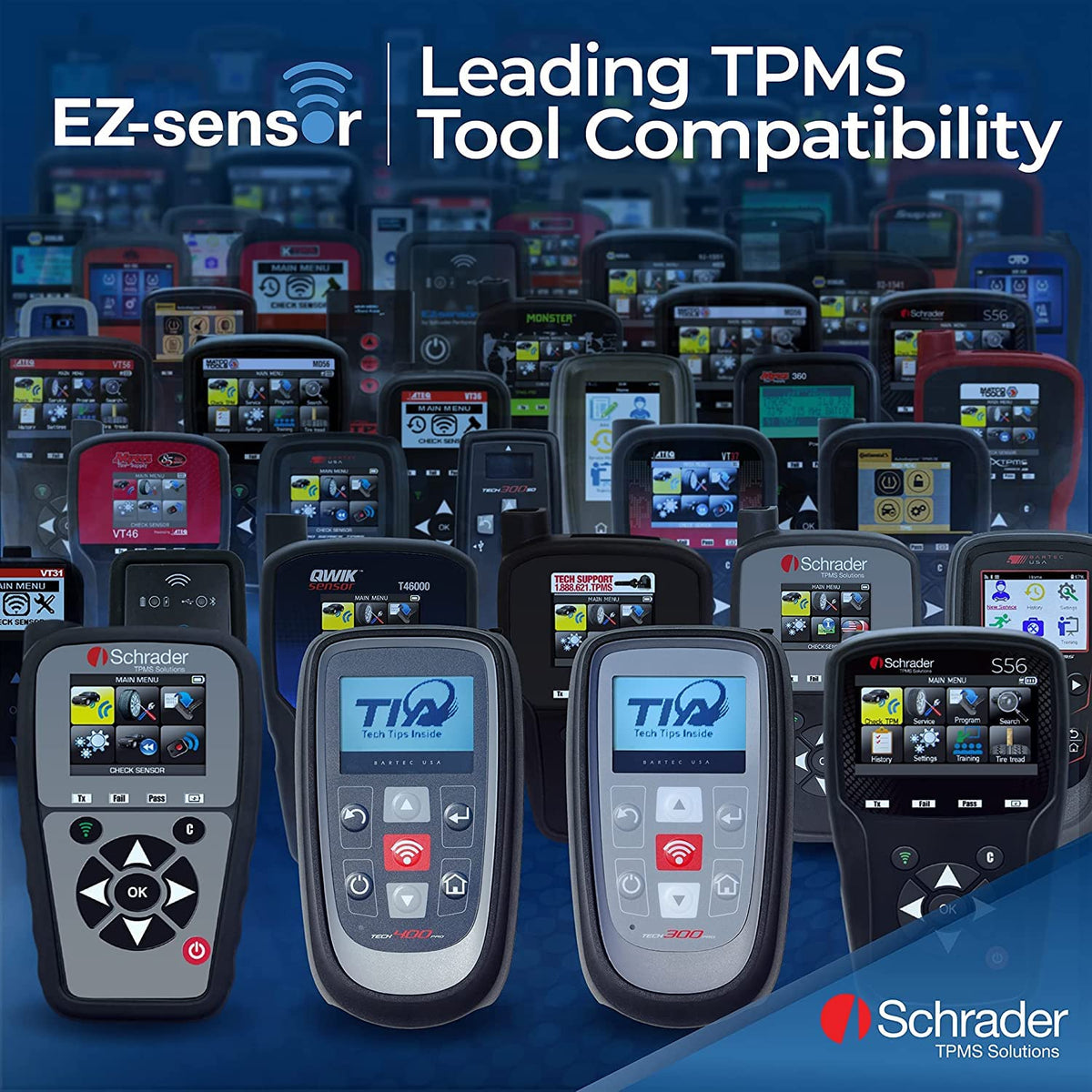 EZ-Sensor must be programmed using a compatible tool (see list below), with the vehicle Year, Make and Model protocol, before installing the sensor into the wheel, and before the relearn procedure is performed. For the best TPMS coverage and service, ensure that your TPMS tool has the latest software update. A high quality TPMS diagnostic tool can... Diagnose and program all TPMS Sensors Provide audit reports Perform re-learn procedures Include OBDII capabilities Compatible Tool List as of March 2024: Schrader ST-1 Schrader S-56 Schrader S-46 Schrader S-41 Schrader EZ-Sensor PAD ATEQ VT-57 ATEQ VT-56 ATEQ VT-36 ATEQ VT-37 ATEQ VT-67 Bartec TechRITEPro Bartec TECH450Pro Bartec TECH600Pro Bartec TECH1000 Bartec TECH400Pro Bartec TECH300Pro Bartec TECH500 Snap-On TPMS5 Snap-On TPMS4 Snap-On TPMS3 For the best TPMS coverage and service, ensure that your TPMS tool has the latest software update.