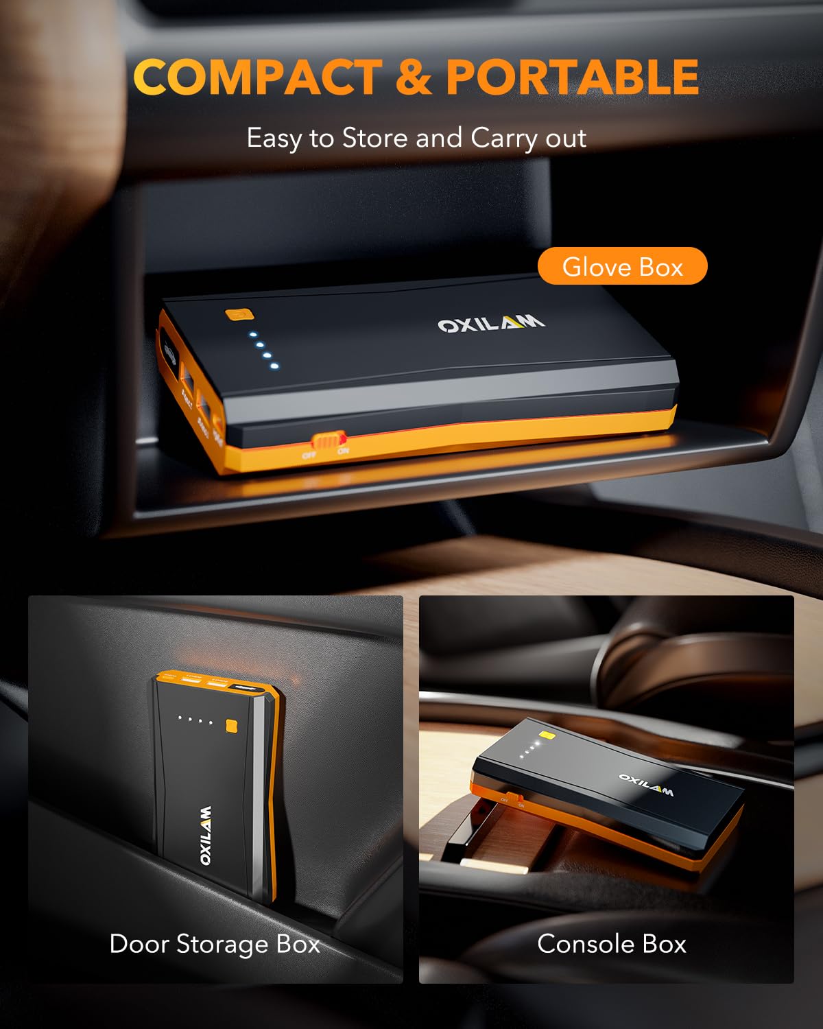 Q: Can I use the OXILAM Jump Starter as a power bank?A: Yes, the OXILAM Jump Starter functions as a portable power bank, featuring 2 USB-A output ports and 1 USB-C input port, allowing you to charge devices like smartphones and tablets while on the go.