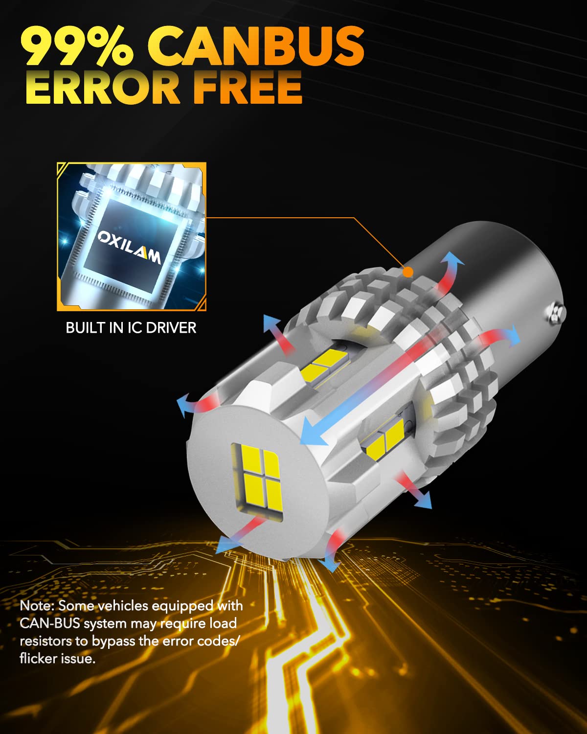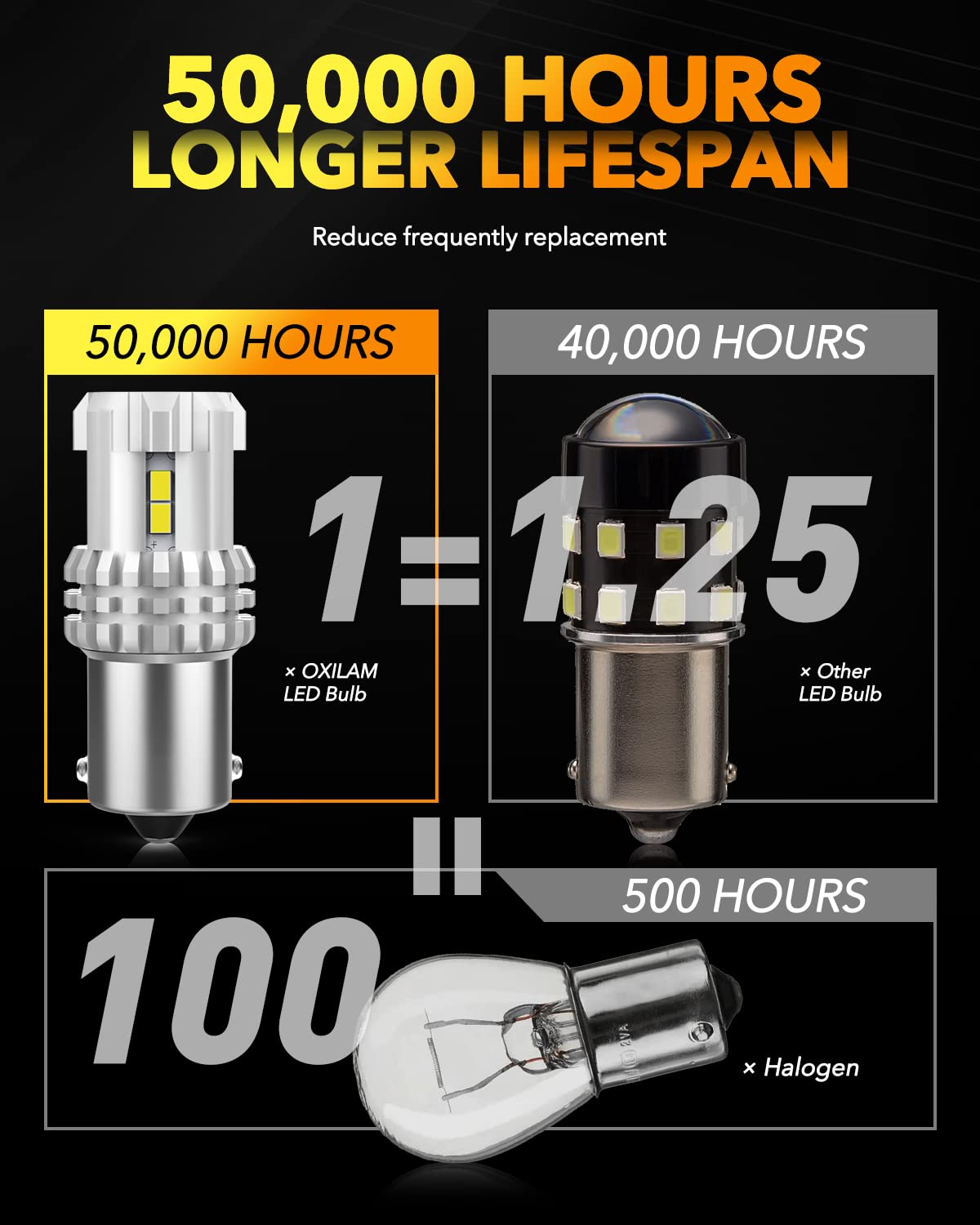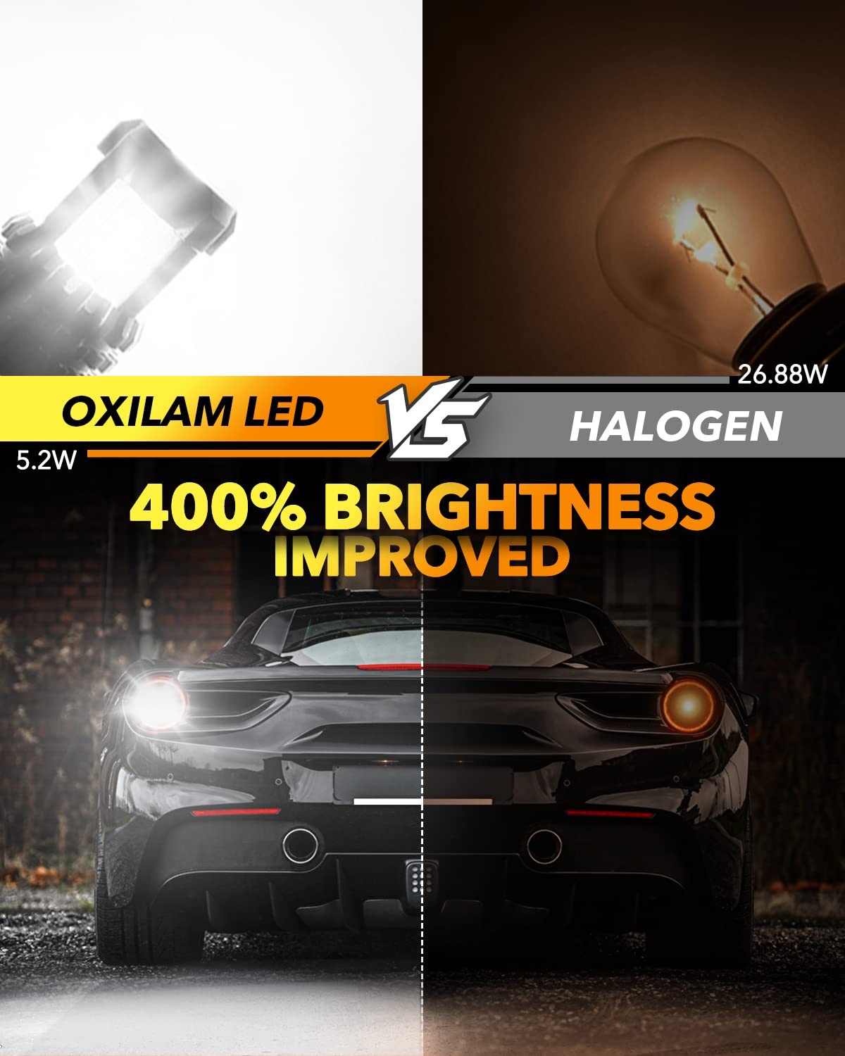 ?400% Brightness Improved?(Set of 2, 6000K Xenon White) With 12 PCS high power 3020smd chipsets, OXILAM 1156 led bulbs are only 5.2W/PC but 4 times brighter than the original bulb,ultra bright & energy saving,give you a wider and clearer view at night | ?Safer and Quicker?360
