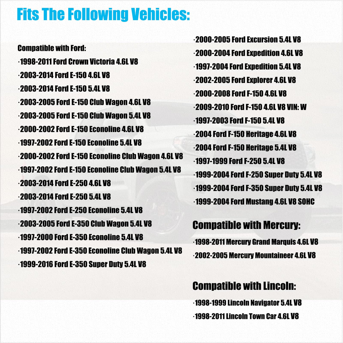 Q: What vehicles are compatible with the OYEAUTO Ignition Coil Pack?A: The OYEAUTO Ignition Coil Pack is compatible with a range of Ford, Lincoln, and Mercury vehicles including models such as F150, F250, F350, E150, E250, Expedition, and Mustang with 4.6L and 5.4L engines.