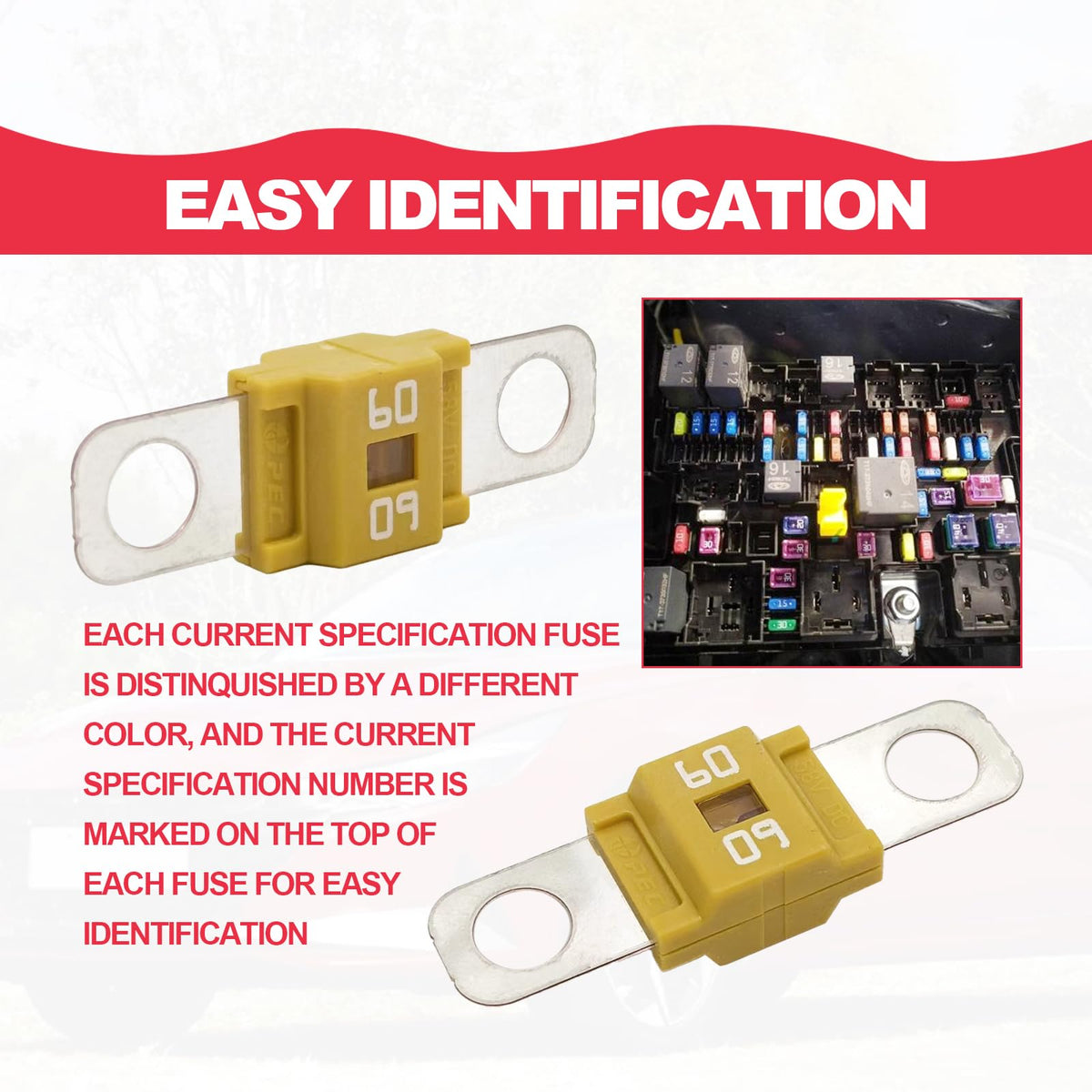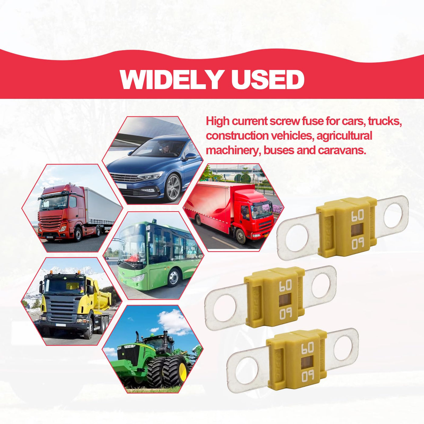 Pack of 3 AMI/Midi Fuse 60 Amp High Current Fuse Bolt-on Fuse, commonly Used in Cars, Trucks, Construction Vehicles, Agricultura