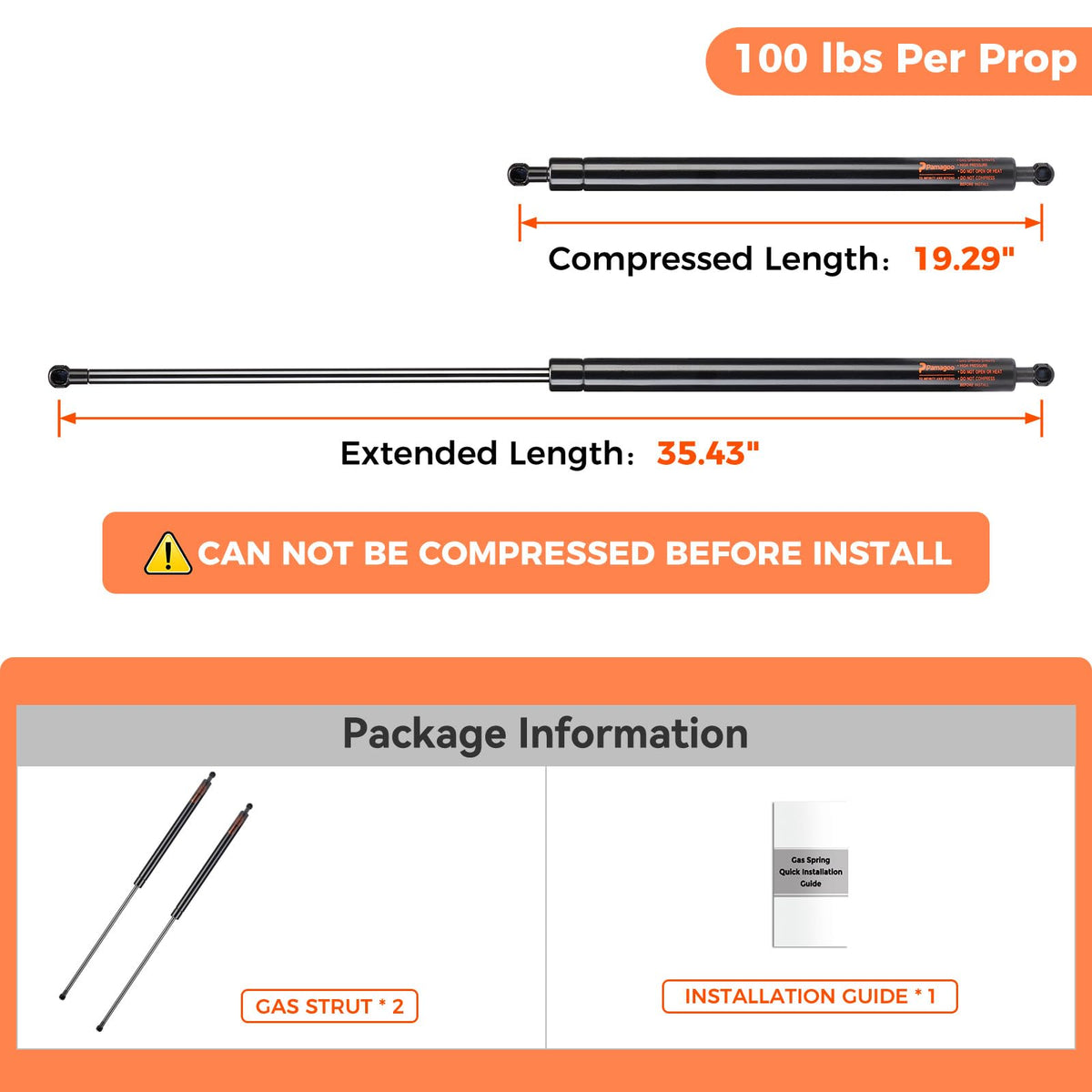 - Q: What is the packaging information for the gas strut? A: The gas strut comes packaged as a two-pack, which includes two thirty-six inch one hundred pound gas struts and an installation guide.