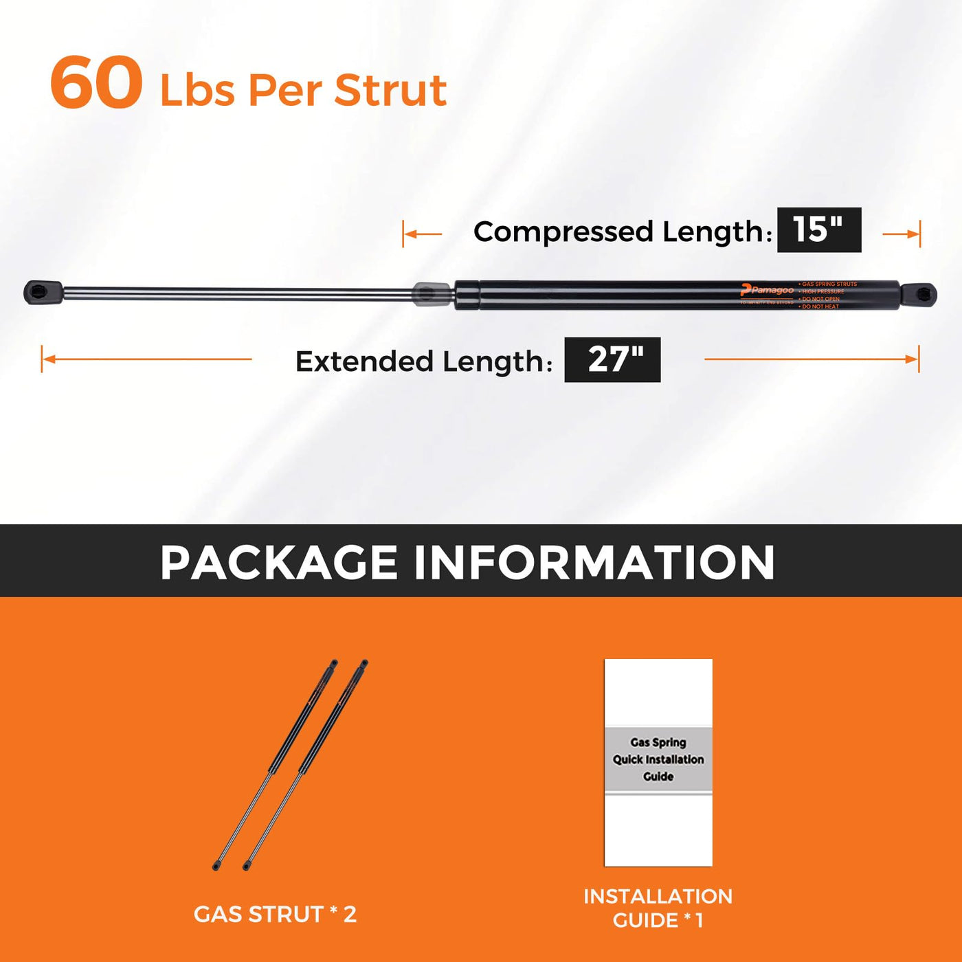 Q: What are the dimensions of the PAMAGOO ML-26-60 gas struts?A: The dimensions are twenty-seven inches in extended length and fifteen point two inches in compressed length.