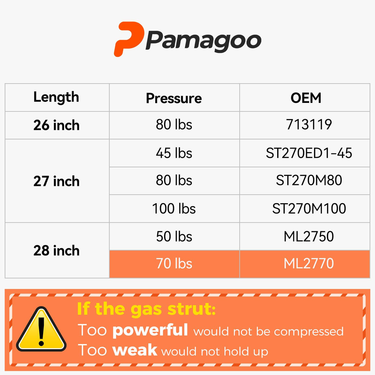 Q: What is the warranty on the PAMAGOO ML2770 gas strut?A: PAMAGOO provides an eighteen-month warranty for the ML2770 gas strut, ensuring customer support.