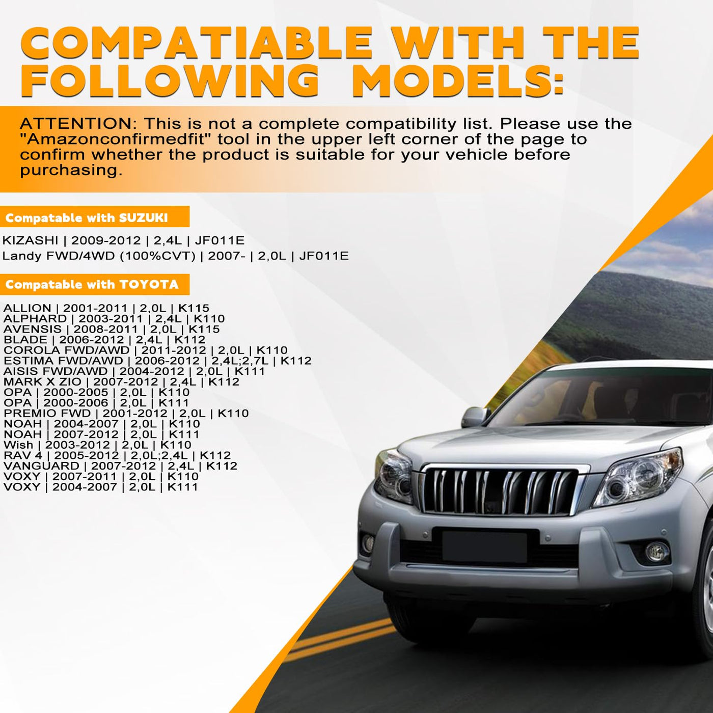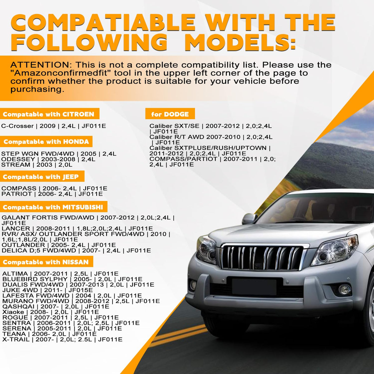 For Nissan: - For Altima | 2007-2011 | 2,5L | Jf011E - For Bluebird Sylphy | 2005- | 2,0L | Jf011E - For Dualis Fwd/4Wd | 2007-2013 | 2,0L | Jf011E - For Juke 4Wd | 2011- | Jf015E - For Lafesta Fwd/4Wd | 2004 | 2,0L | Jf011E - For Murano Fwd/4Wd | 2008-2012 | 2,5L | Jf011E - For Qashqai | 2007- | 2,0L | Jf011E - For Xiaoke | 2008- | 2,0L | Jf011E - For Rogue | 2007-2011 | 2,5L | Jf011E - For Sentra | 2006-2011 | 2,0L; 2,5L | Jf011E - For Serena | 2005-2011 | 2,0L | Jf011E - For Teana | 2006- 2,0L | Jf011E - For X-Trail | 2007- | 2,0L; 2.5L | Jf011E