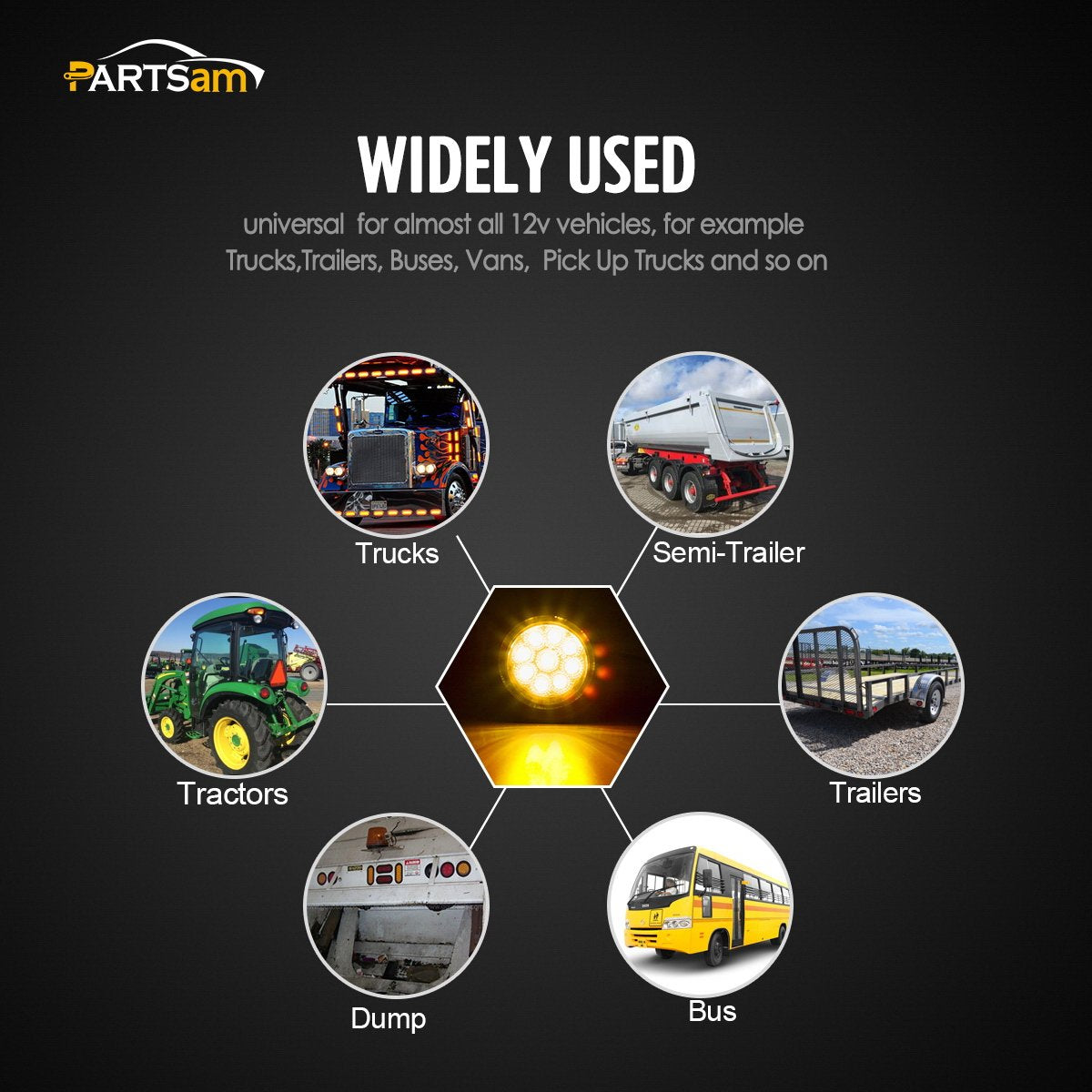 Q: What vehicles are compatible with the Parstam 2 inch amber LED marker lights?A: These 2 inch amber LED marker lights are designed to be compatible with a wide range of vehicles, including trucks, pickups, trailers, tractors, dump trucks, buses, vans, and RVs. They are also suitable for heavy trucks like Peterbilt, Kenworth, and Freightliner.