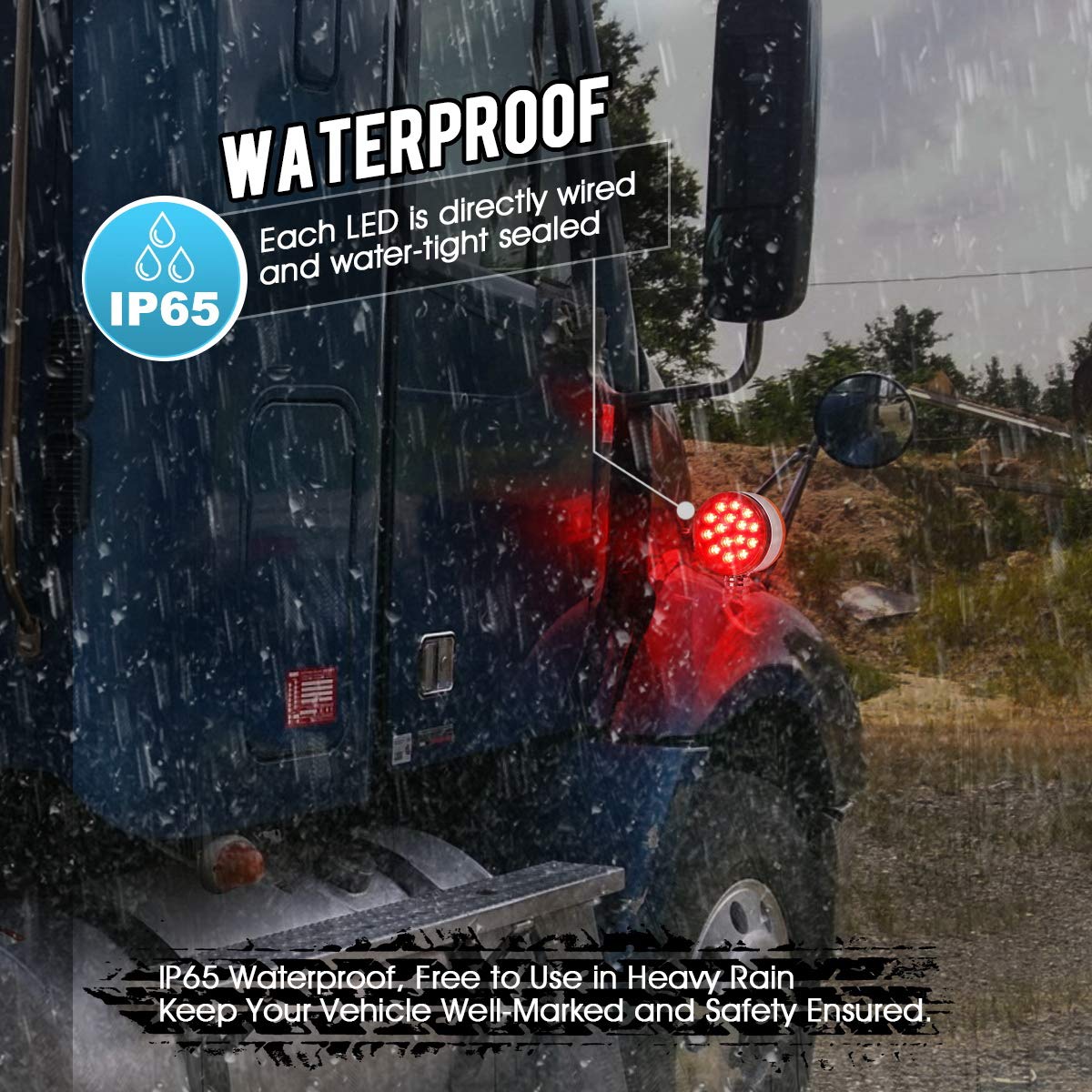 2Pcs 30 LED Red/Amber Double Face Chrome Round Pedestal Lights Dual-face trailer light -- Red side serves 3 functions - stop, turn and tail light -- Amber side serves 2 functions - parking and rear turn signal light Description: -- Each LED pedestal light emits red illumination(15LED) from one side and amber illumination(15LED) from the other. -- High impact polycarbonate lens and housing and reflector are sonically sealed to prevent damage from moisture and corrosion -- DOT compliant for street legal lighting -- Premium quality pearl LED (light emitting diodes) lights are a great choice to dress up your ride with bright LEDs. -- Each individual diode comes with mini reflector giving the light a clean,custom look and superior light distribution. -- LEDs are brighter and have lower amperage draw making it possible to add more lighting without upgrading your charging system. -- This double faced amber/red pedestal LED is commonly used for additional visibility in stop/turn/tail functions in heavy and medium duty trucks. -- The placement is versatile. -- Available with Amber / Red Lens, Amber / Amber Lens, Amber / Red LED and Clear Lens, Red / Red Lens Application: Kenworth Peterbilt Freightliner and other Truck lights Wire Connection Tips: White Wire is the Ground; Gray Wire is low brightness,Red Wire is highbrightness Package Included: 2x 3'' Inch round dual face trailer lights Compatibility: Freightliner: Cascadia, Century, Classic, Columbia, Coronado, FL70, FLD112, FLD112, (Set, back, Axle), FLD120, M2 Kenworth: K100, T2000, T300, T600, T660, T680, T700, T800, W900 Peterbilt: 330, 335, 367, 377, 378, 379, 386, 387, 389, 579, 587 International: 4300, 4700, 9200, 9300, 9400, 9670, 9900, Paystar, 5900, Prostar, TranStar, 8500, &8600, Workstar, 7600
