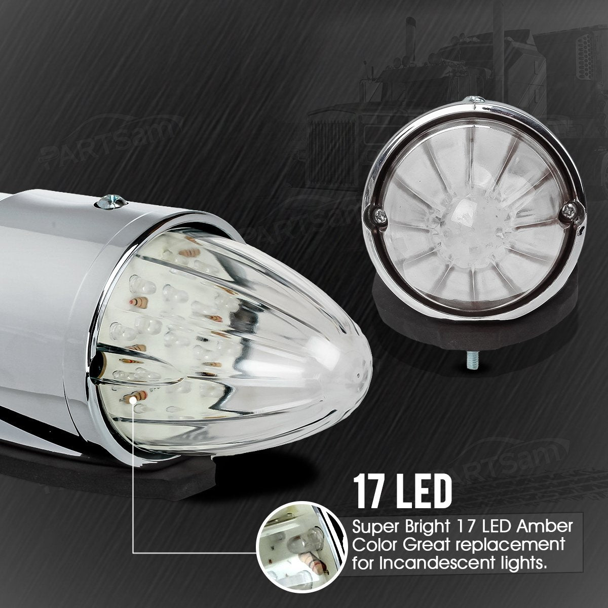 The Partsam 17 LED Clear/Amber Semi Truck Bus RV Roof Cab Marker Lights are designed for universal application on trucks, trailers, tractors, semi-trailers, dump trucks, buses, boats, and special vehicles. These lights provide optimal visibility and safety for heavy-duty vehicles, making them essential for both professional drivers and fleet operators.
