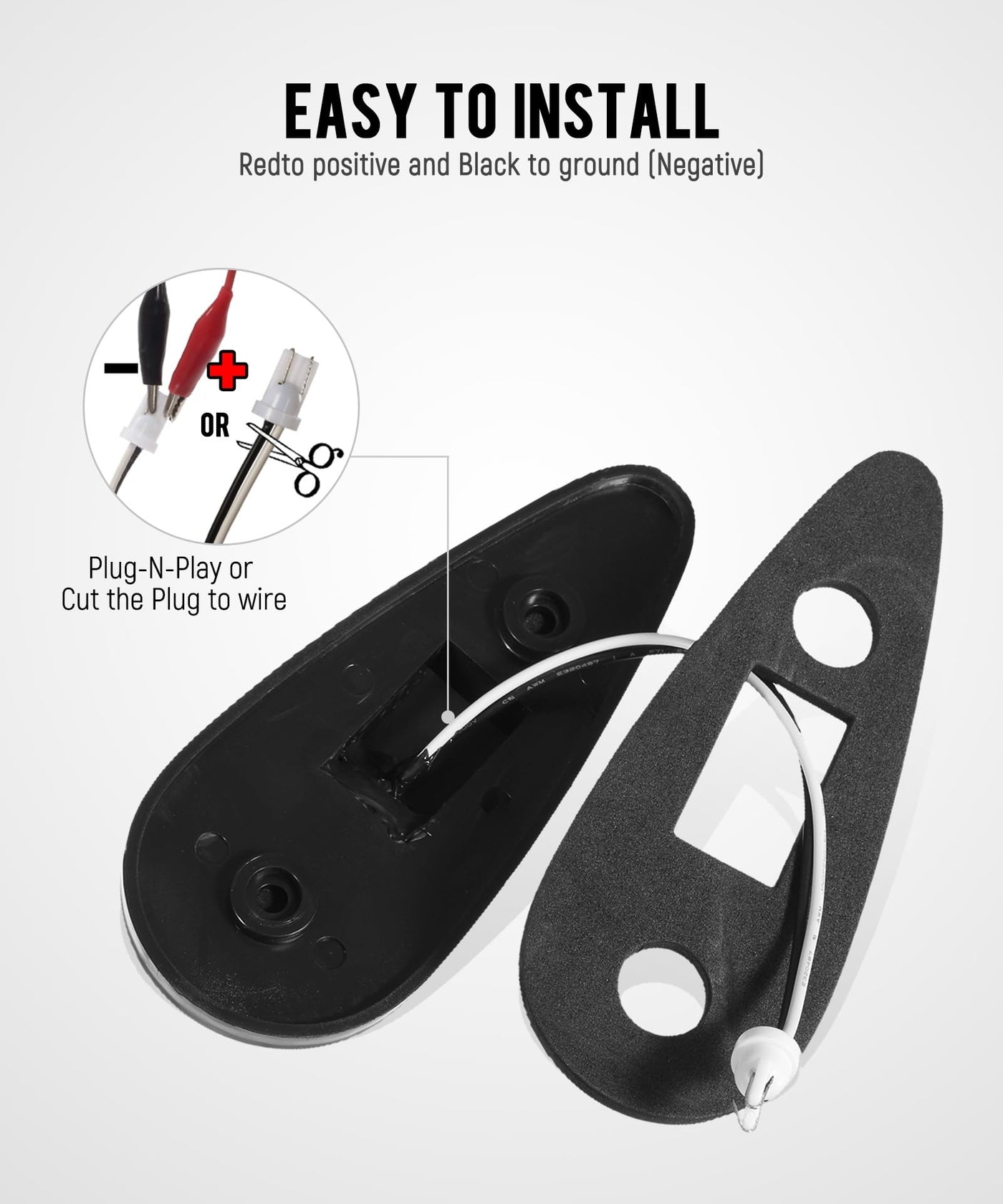 Q: What type of wiring is required for installation?A: The wiring for the Teardrop Cab Lights includes a black wire for positive connection and a white wire for negative (ground). If the lights do not fit your stock sockets, you may need to cut the connectors for proper wiring.