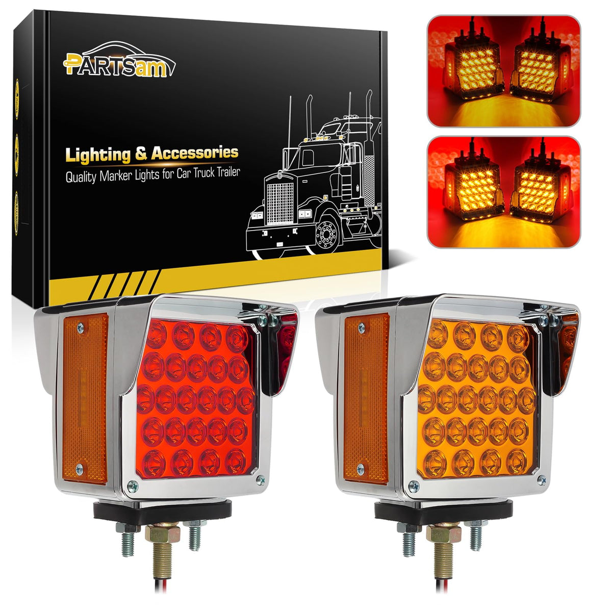 Q: What are the main features of the Partsam LED lights?A: The Partsam LED lights feature a dual-color design with 52 super bright LEDs (24 Amber and 24 Red, plus 4 side marker Amber LEDs). They serve multiple functions including stop, turn, tail, park brake, and side marker clearance lights. Additionally, they come with a stylish chrome bezel and visor for an enhanced look.